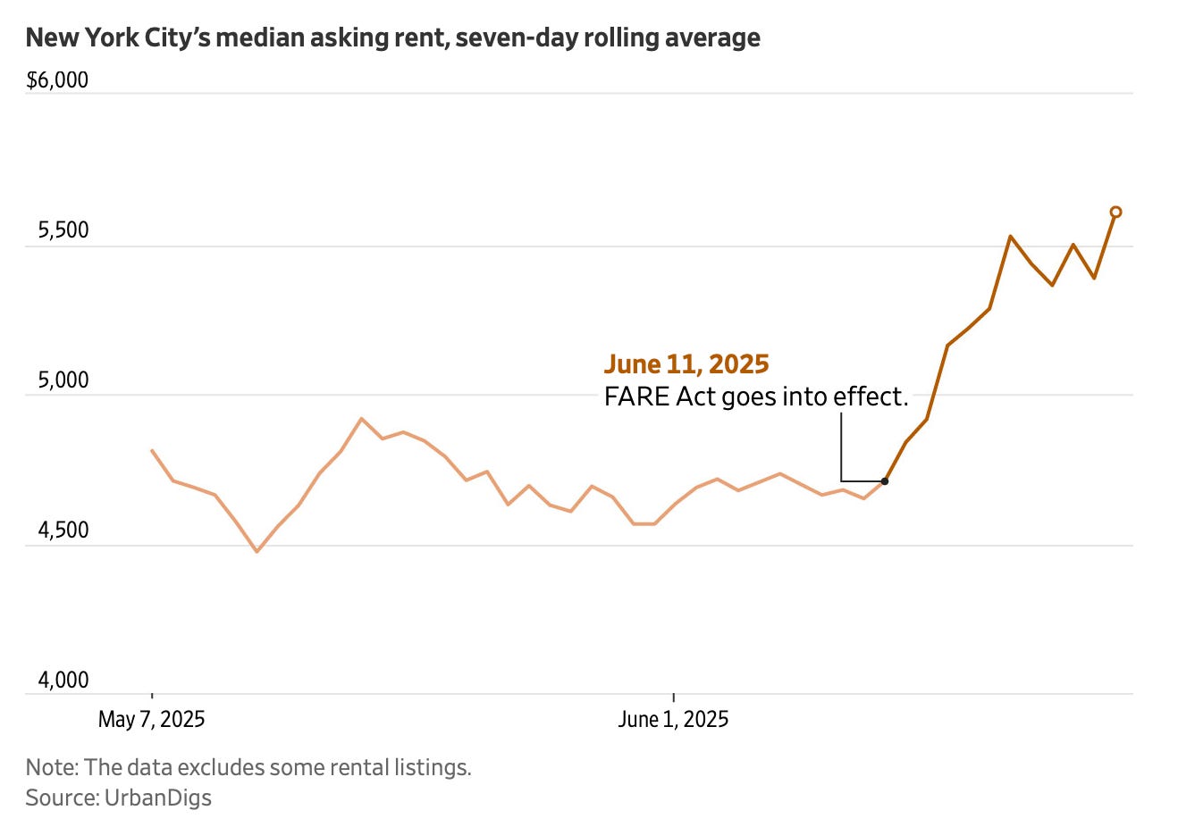 The NYC Democratic primary results gave the win to 33-year-old state assemblyman Zohran Mamdani. The real estate industry was stunned by the results, especially after the winning candidate’s comments about freezing rents. The industry was still reeling from the passing of the FARE Act, which promoted the misleading idea that it would save tenants money on rent. I was on a panel yesterday with my friend Noah Rosenblatt of Urban Digs, who created this chart for a WSJ article: New York’s Housing Crisis Is So Bad That a Socialist Is Poised to Become Mayor [gift link], about the election results.