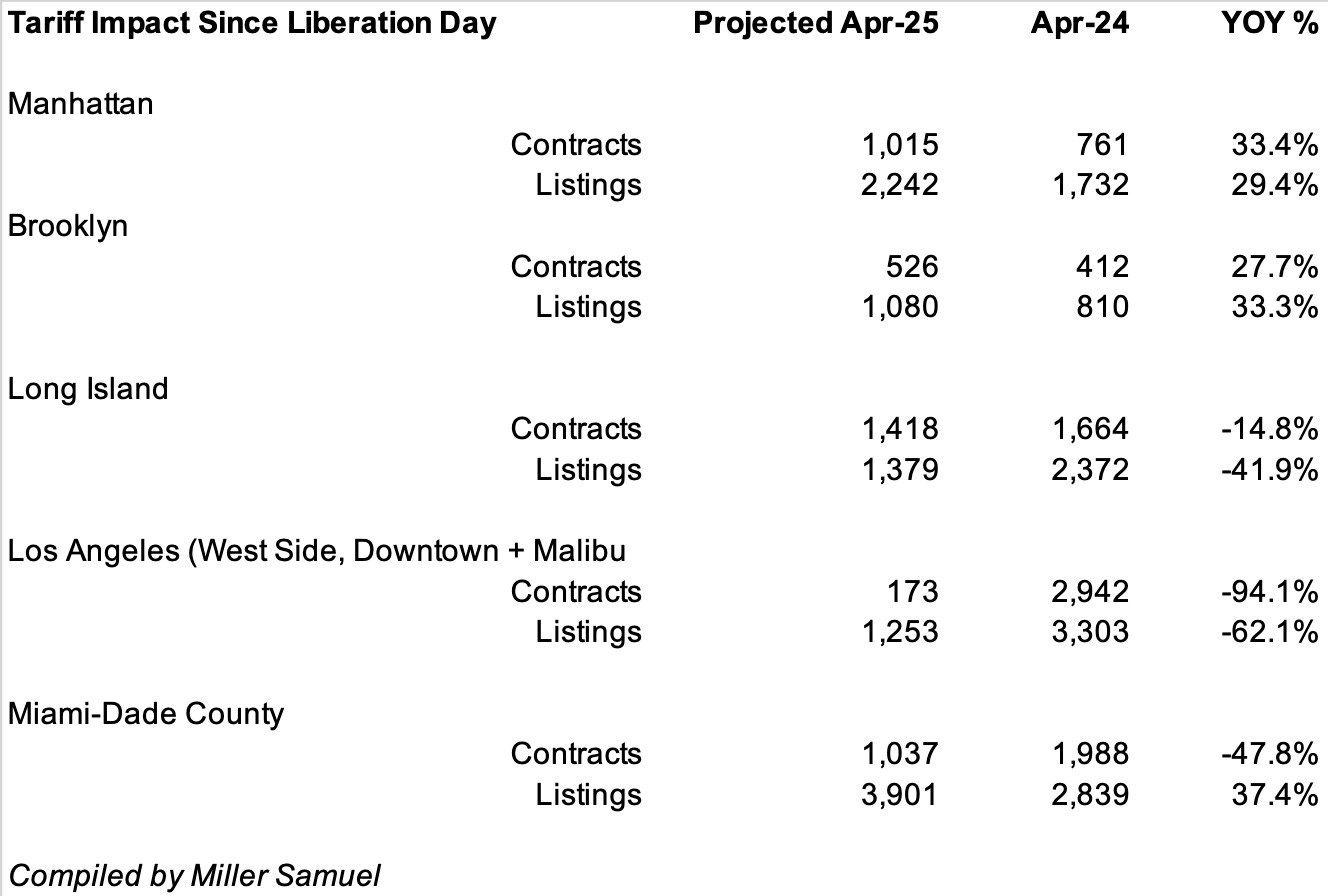 New York is pushing on without much evidence of an impact, while Long Island saw consumers withdraw a lot of listings. Los Angeles County experienced a significant drop in contracts and listings; given the trauma that the market has undergone with all the wildfires, it is understandable. Miami-Dade County saw less of a decline in contract signings in April than LA, but listing inventory rose instead of falling.