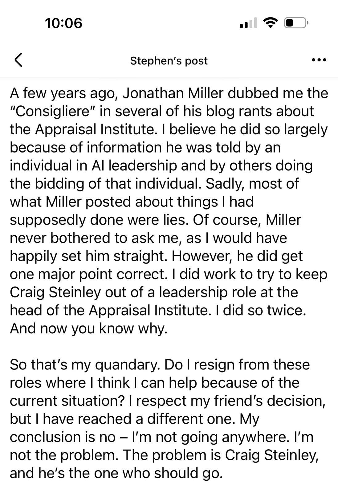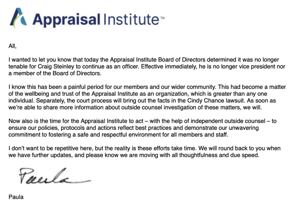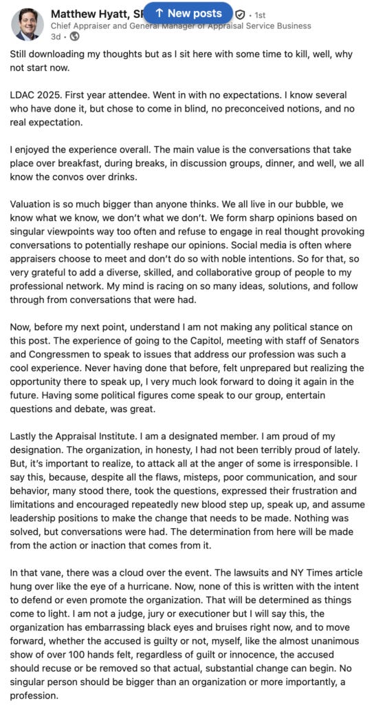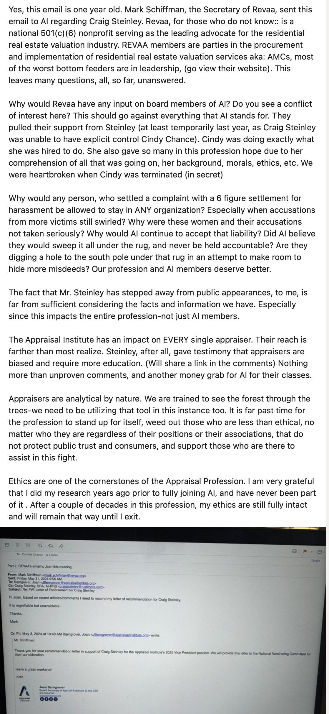 This #metoo moment is not just about Steinley. There has been a long-term tolerance of this awful behavior. For comparison, NAR’s president resigned within 24 hours after similar accusations were reported by NYT in 2023. NAR’s swift action tells you all you need to know about the ethics of much of the Appraisal Institute leadership. They have been blatantly corrupt for nearly two decades, shortchanging their membership by starving them of all information and enriching themselves with perks.