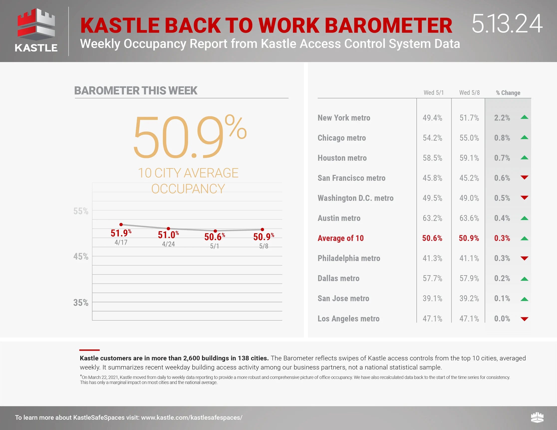 Remember that Kastle charts are overstating occupancy* because their pre-pandemic occupancy benchmark was 100%, which is incorrect (*measures card swipe activity as a proxy for occupancy). Still, they’ve become the standard benchmark for occupancy rates.