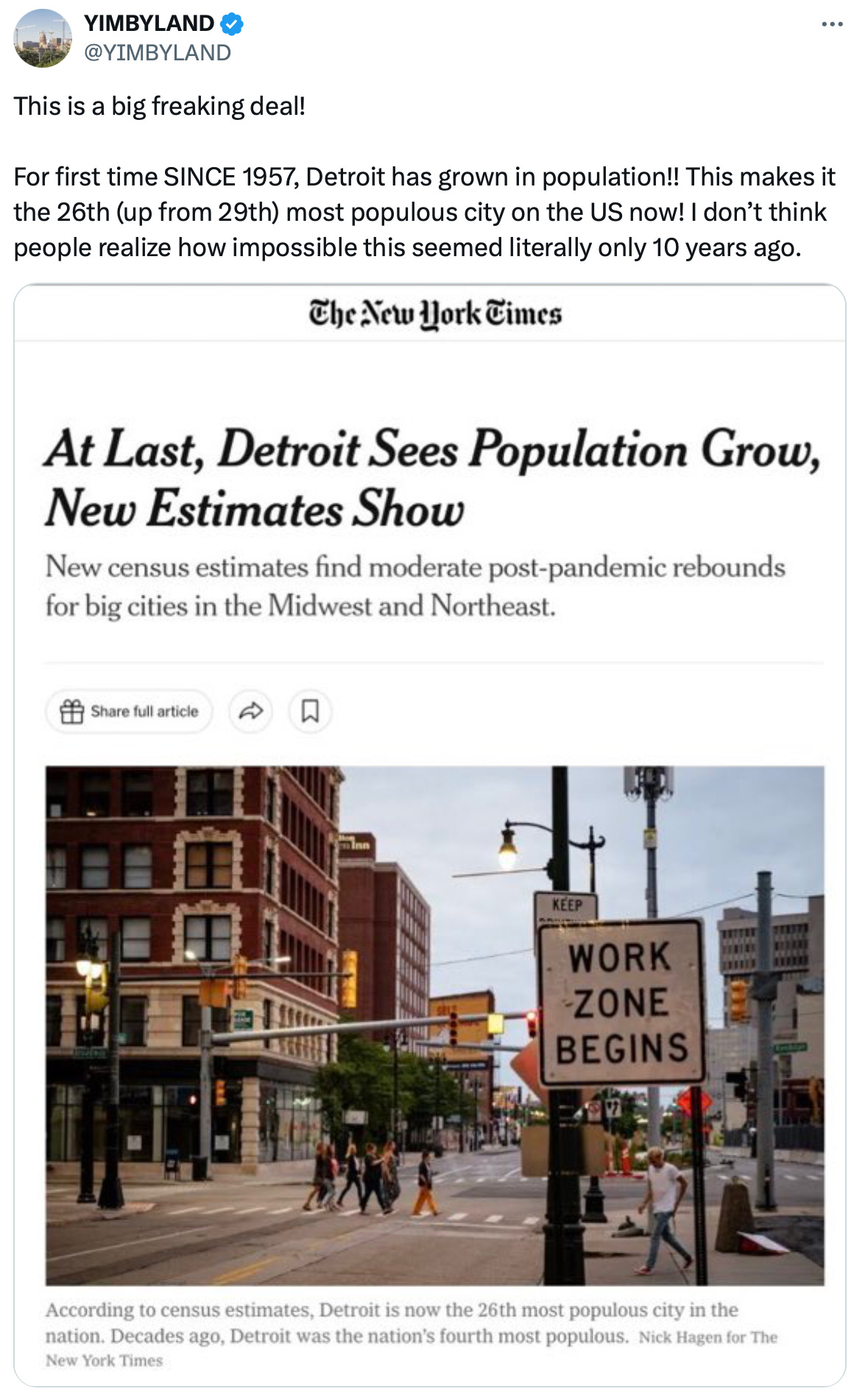 But let’s be contrarian by looking at Detroit, where a bunch of my family lives. This NY Times piece on Detroit’s population actually growing for the first time since 1957 is something I thought I would never hear in my lifetime. I suppose I have to thank Quicken Loans for revitalizing the downtown. Rules of thumb on population we grew up with are being broken all the time.