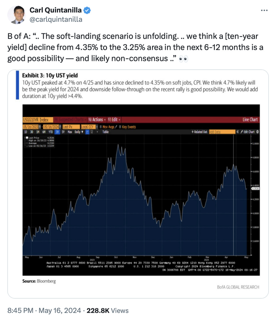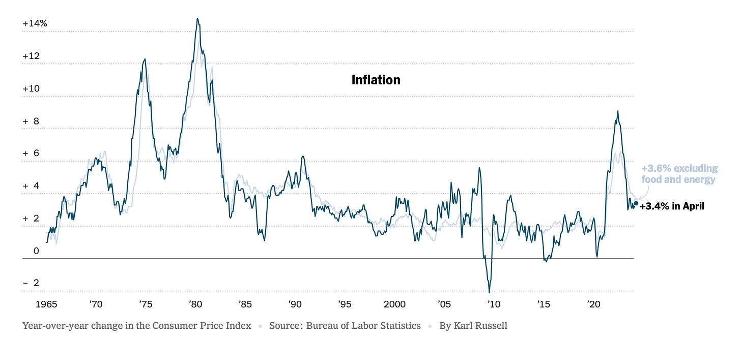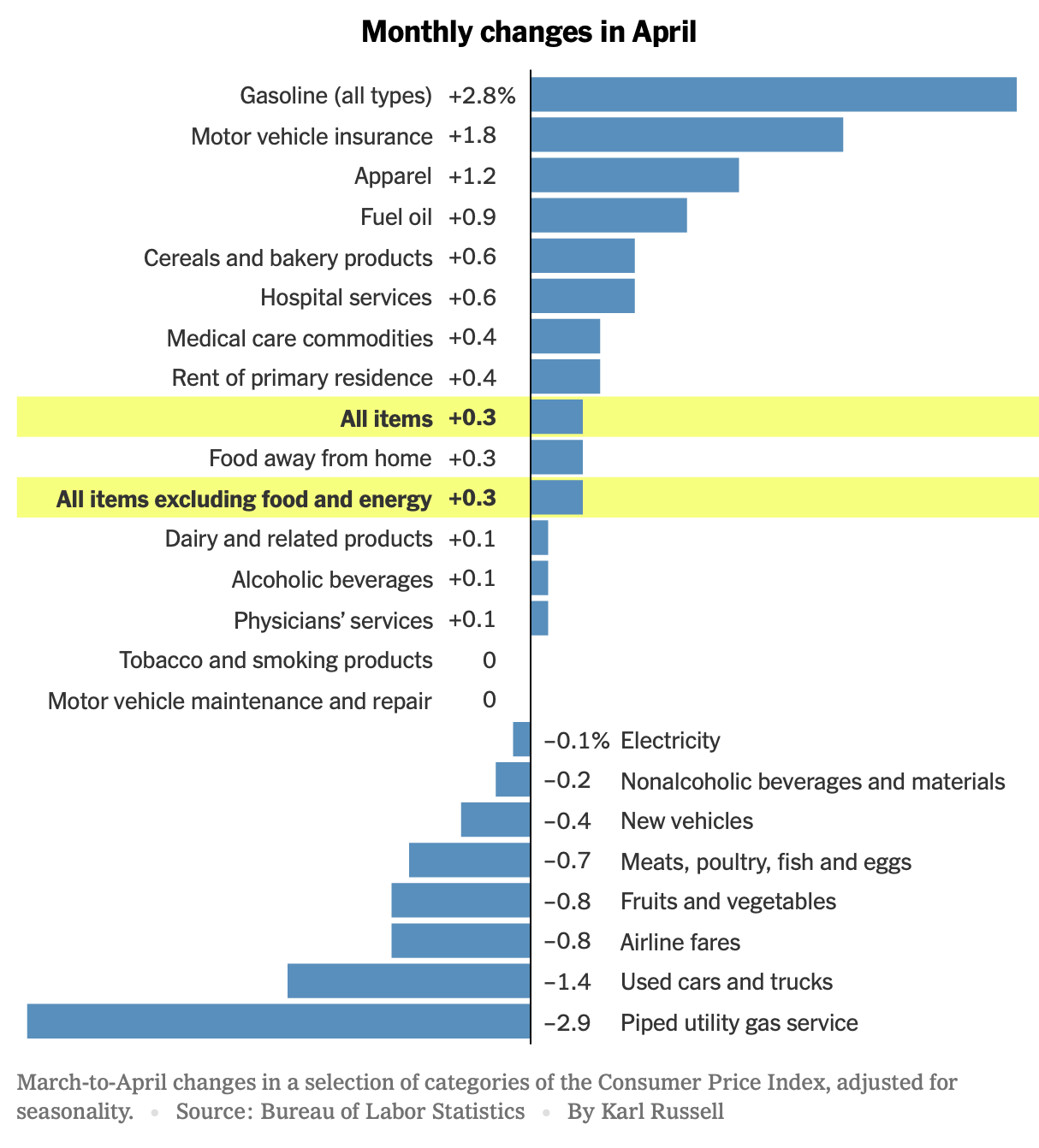 Also, inflation seems to be settling around 3% for now in this excellent NYT piece: Inflation Moderated Slightly in April, Offering Some Relief for Consumers.