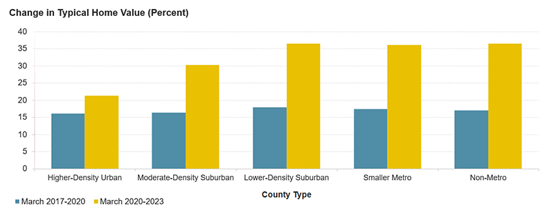 …rapid home price growth was not uniform geographically. The expansion of remote work enabled many households to look further afield for housing, accelerating migration trends away from larger, higher-cost places in favor of lower-density, lower-cost counties and rural areas.