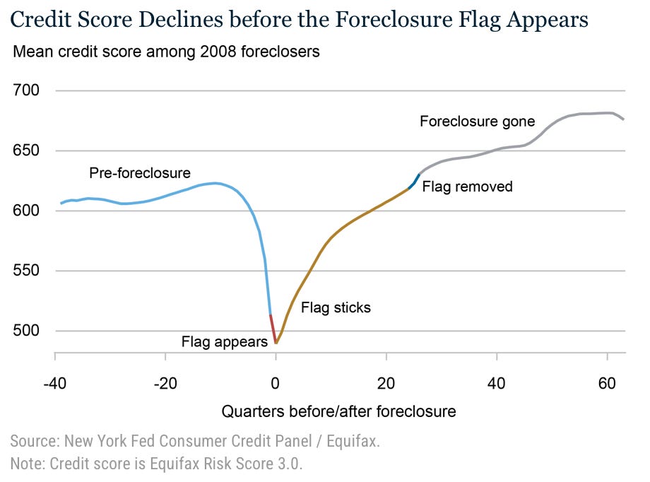 The period of delinquency before the foreclosure starts results in a 150-point credit score drop on average and with an average score falling below 500; the addition of the flag itself is associated only with a small additional decline in the score. The average credit score steadily improves from that point as the foreclosure note ages, eventually increasing by an additional average of 20 points when the foreclosure note drops off.