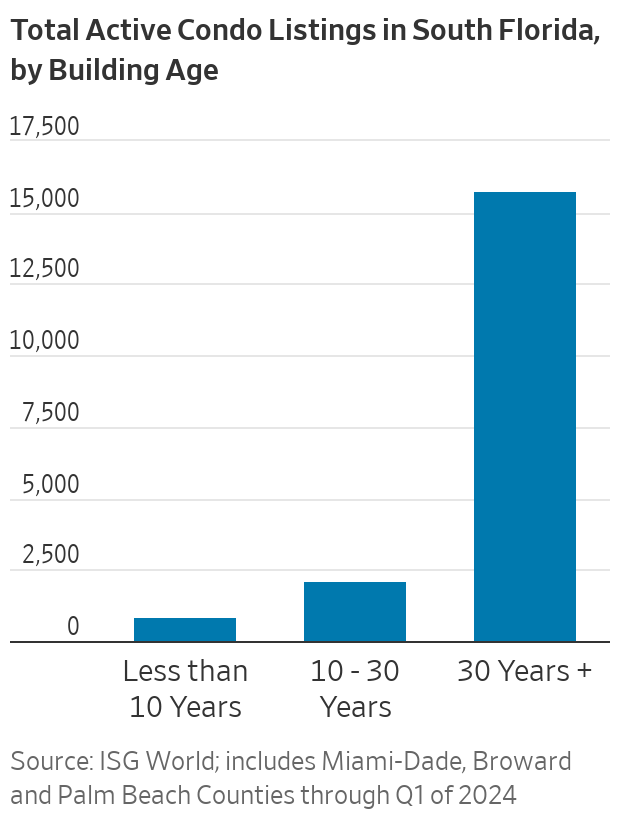 The WSJ did a good piece on the Surfside collapse aftermath in New Florida Law Roils Its Condo Market Three Years After Surfside Collapse. The rise in supply in South Florida is skewed heavily toward buildings older than thirty years, which has created two different markets. It’s a tough situation for those in those older buildings looking to sell, especially as banks push back, necessitating cash buyers. Newly developed units tend to be a lot more expensive than older resales.