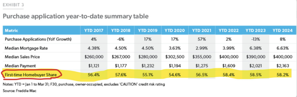 Looking at purchase application data of first-time homebuyer purchase applications from Freddie Mac, it is unfazed by higher mortgage rates – remarkably consistent. This insight is from Jay Parsons, an essential follow on Housing Twitter, even though Twitter/X has become hit-or-miss, limited engagement toxicity.
