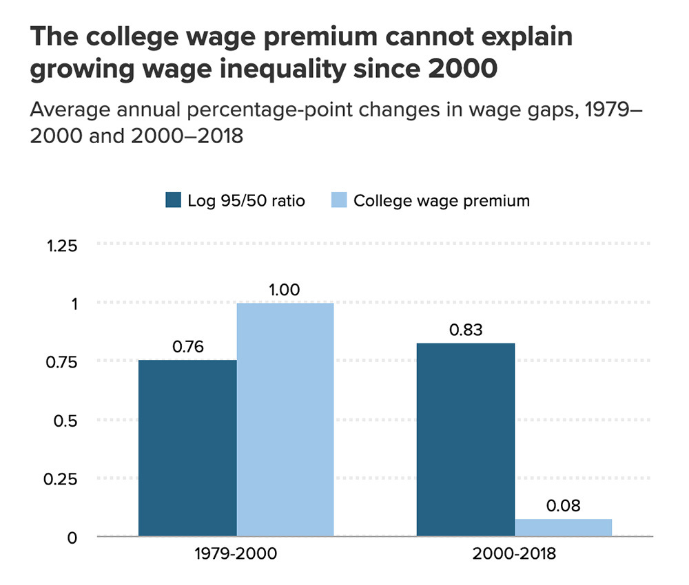 At first glance, a college education could be an explanation for the wealth gap, except that the college premium ended around 2000. This pattern aligns with the recent conversations about reevaluating the cost-benefit of a college education. The cost, through effortless access to credit without restraints, has ballooned the cost of college, wiping out the return on investment for a degree.
