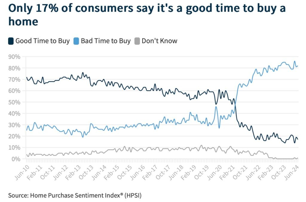 As I mentioned in a previous post about sentiment, it accounts for how consumers feel about the future and less about the present. A pivot in expectations about rate cuts could change future expectations about home sales. While I’m not suggesting that the majority of consumers will have a wildly positive sentiment toward home-buying in August, I would expect a shift to higher home sale expectations in Fannie’s next forecast.