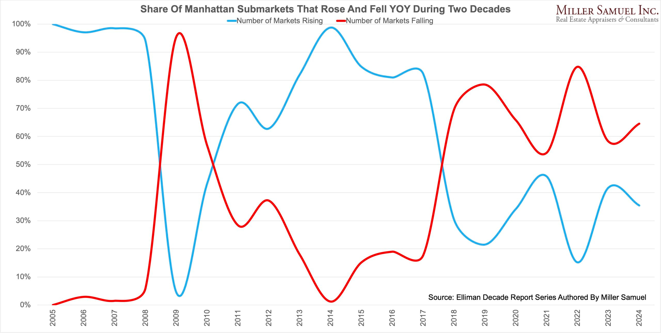 Share Of Manhattan Submarkets That Rose And Fell YOY During Two Decades