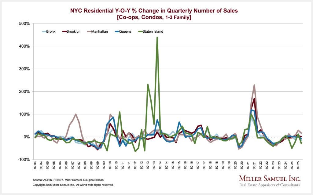 On a YOY basis, the patterns of all five boroughs are remarkably in sync. The 2013 spike in Staten Island was attributable to the slowdown and catch-up of the Richmond County ACRIS data feed.