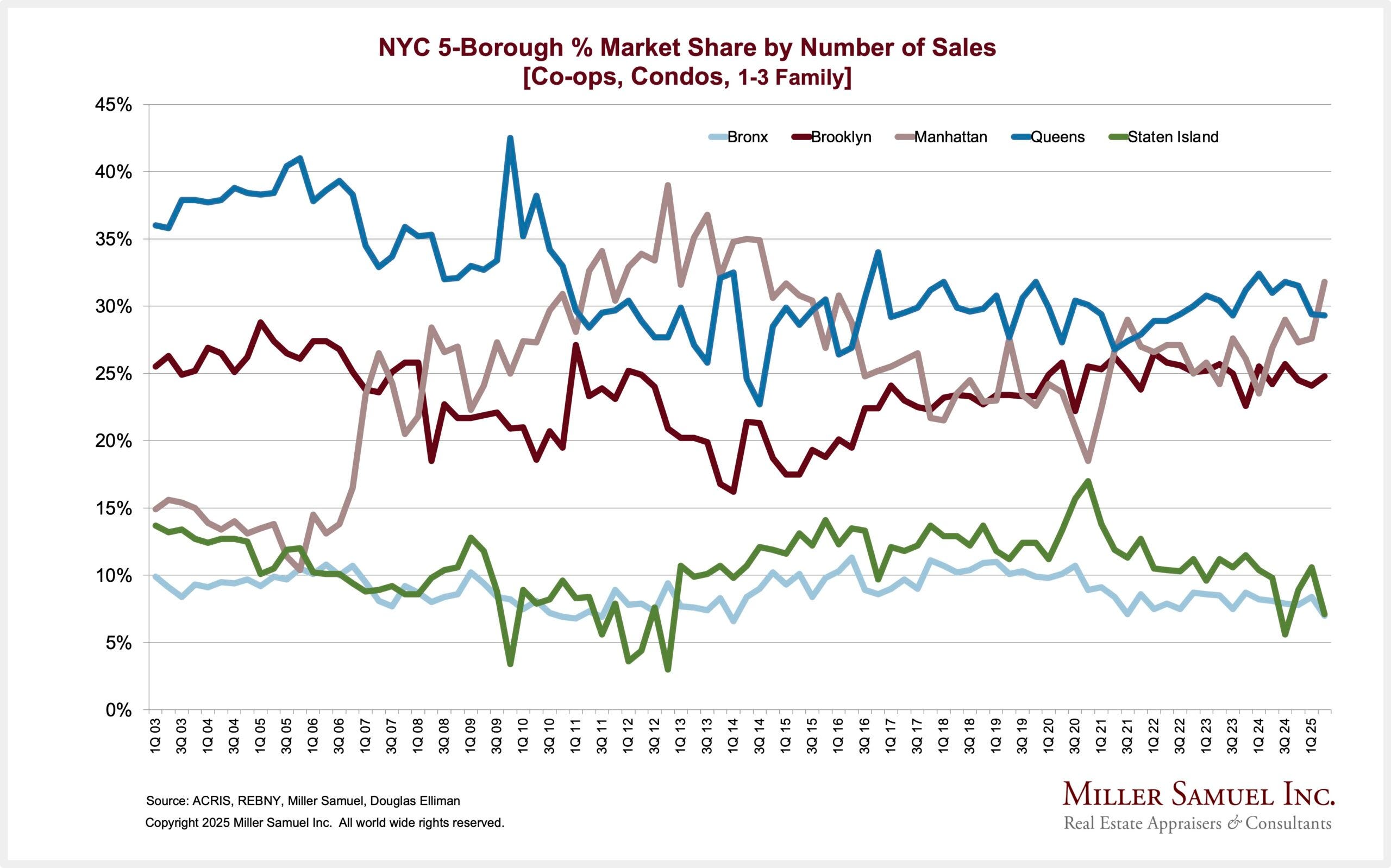 Since it’s Friday and I’m tired after a long week, this post goes against my policy content standard that emphasizes writing over visuals. I’m still thinking about the cilantro I had in a recent dinner, as well as getting my tongue soaped by my 5th-grade teacher for saying “damn” on the playground when I fell hard from the swingset at recess. But I digress. Even though many readers of Housing Notes are not from the NYC Metro, you may find the results of the Q2 breakdown and analysis interesting. I’ve been authoring quarterly market reports for Manhattan, Brooklyn, and Queens for several decades, and Douglas Elliman publishes them. Separately, I track the Bronx and Staten Island as well as the entire NYC market. Incidentally, many people refer to Manhattan as “NYC,” yet “NYC” technically refers to the five boroughs. I think the confusion stems from the idea that Manhattan is often referred to as “The City” by people who have second homes in the surrounding suburban metro area, and those locations tend to be called “The Country.” When speaking to market conditions, NYC sales are down nominally year over year, but down substantially from the supercharged market conditions of 2022. I also looked at how much each borough contributes to units sold and sales dollar volume. Manhattan sees the highest number of units and the most sales dollar volume, while the Bronx saw the smallest share of both sales by units and by dollar volume.