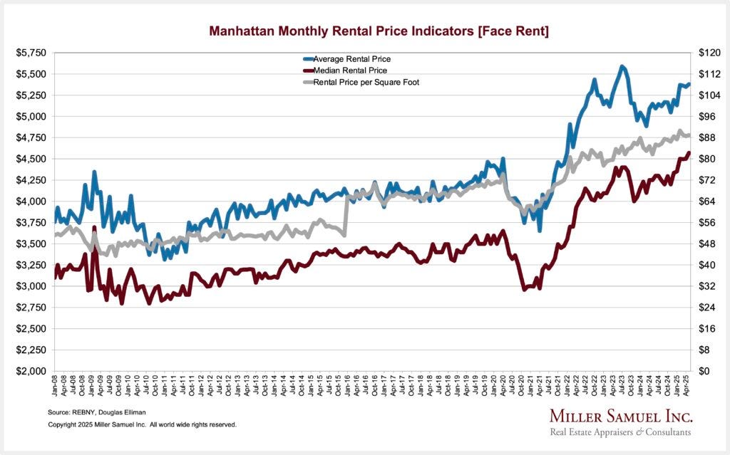 Manhattan rental prices continue to trend higher as sales volume is held back by higher mortgage rates, even within a market that is 60% cash. Manhattan’s median rent reached a record high for the third month in four. I want to suggest that housing participants obsess too much over the level of mortgage rates, with a prognosis of potentially lower rates in a few years after the damage caused by tariffs takes hold.