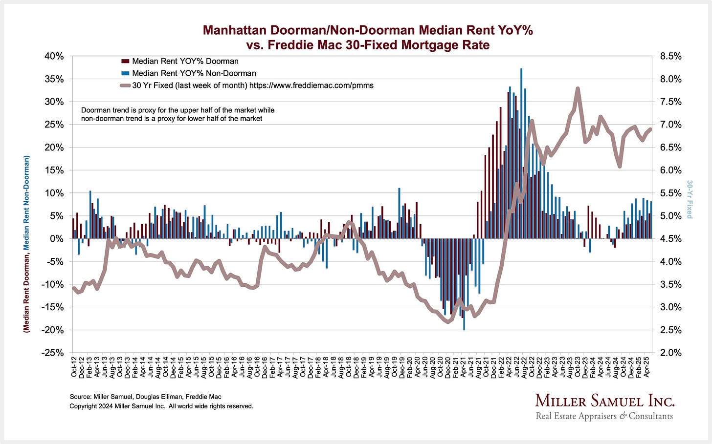 While I closely track the NYC rental market, it’s getting harder to find words to rhyme with “rental” after overusing “mental” and “dental” in previous posts. While finding words to rhyme isn’t exactly brain surgery, I couldn’t find a good word to rhyme, so I gave up. With the massive NYC rental price surge from 2021 through 2023 coming out of the pandemic era, both high and low-end price growth cooled by 2024. By “cooled,” I really mean that the rate of rental price gains eased. However, US consumers expected mortgage rates to slide in 2025, that would boost sales but poach demand from the rental market. But Liberation Day came, and everything about the Tariff Tantrums reduced the chances of lower mortgage rates. It’s been fascinating to watch a few economists struggling to use Pretzel Logic to make the tariff storyline sound good for the economy. Businesses say they are raising prices on goods without tariffs, just because. Mortgage rates remain tucked just under 7% and don’t seem to be going anywhere. As an aside, mortgage rate stability is probably the second-best thing for the housing market if mortgage rates remain where they are.