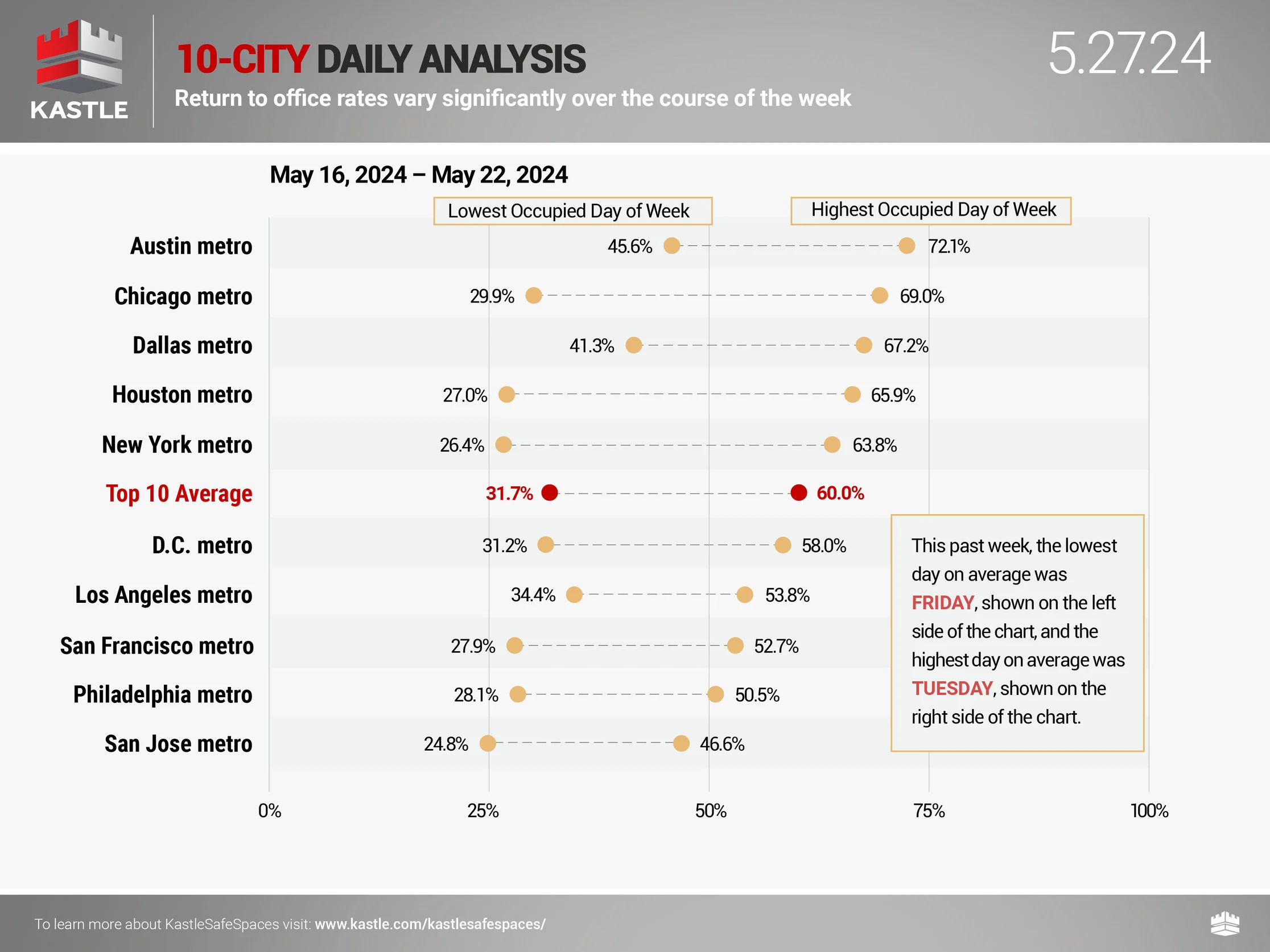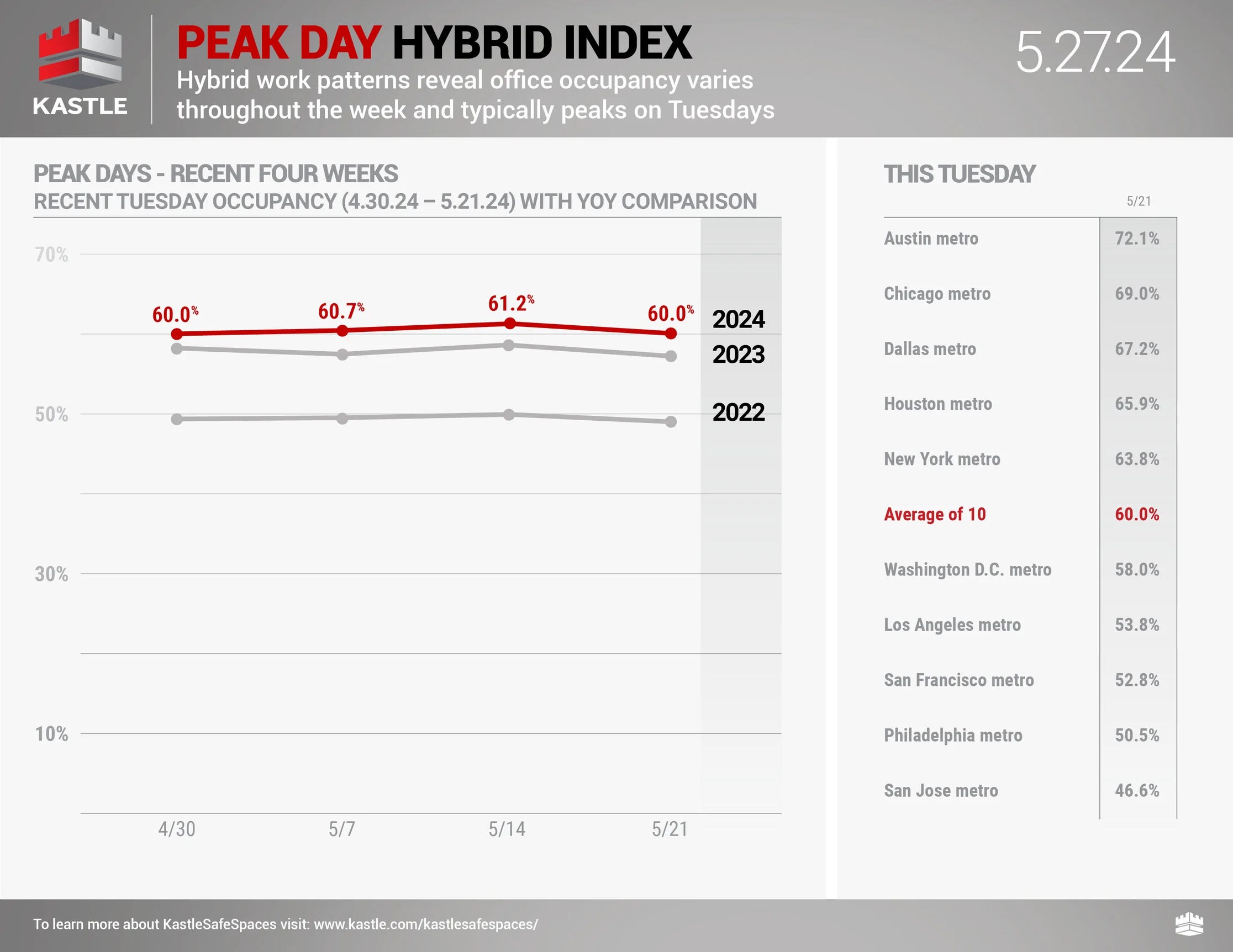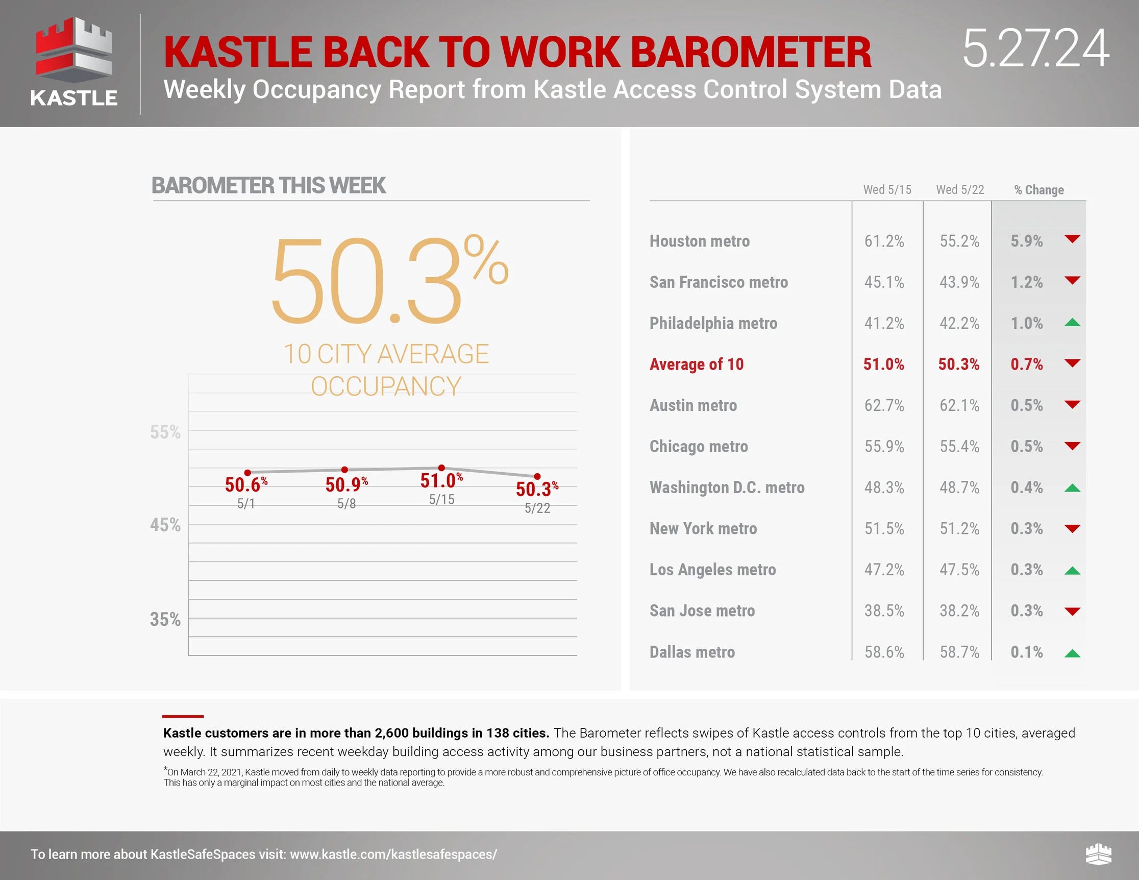 Remember that Kastle charts are overstating occupancy* because their pre-pandemic occupancy benchmark was 100%, which is incorrect (*measures card swipe activity as a proxy for occupancy). Still, they’ve become the standard benchmark for occupancy rates.