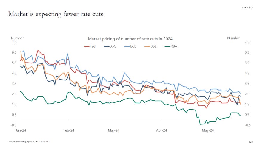 The more the Fed talks about their next move as a cut, the harder it becomes to cut – Apollo. Everyone is now expecting fewer cuts.