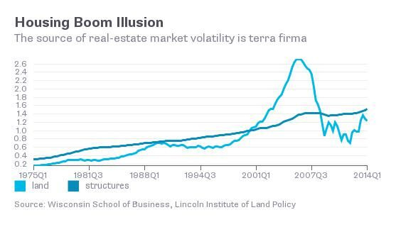 I touched on the idea that land was responsible for most of the price appreciation and not the improvements (i.e. the house) for a Bloomberg column I wrote almost a decade ago: Housing Bust Wasn’t About the House and I used this chart to illustrate: