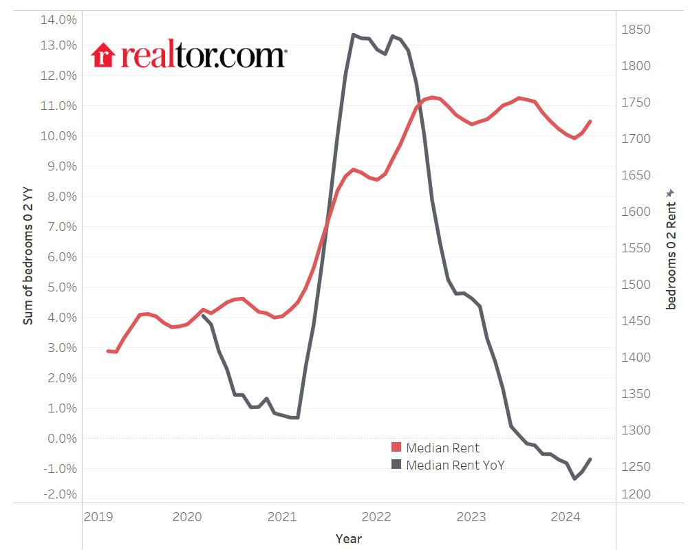 To top that, consumers don’t seem to believe the Federal Reserve these days and it is creating a paradox (explained further down), with mortgage rates stuck at an elevated level, rents are going to rise again. Realtor.com shows this in the following chart: “Rents Decline Again, but Nationwide Rent Is Just 1.9% Below 2022 Peak.”