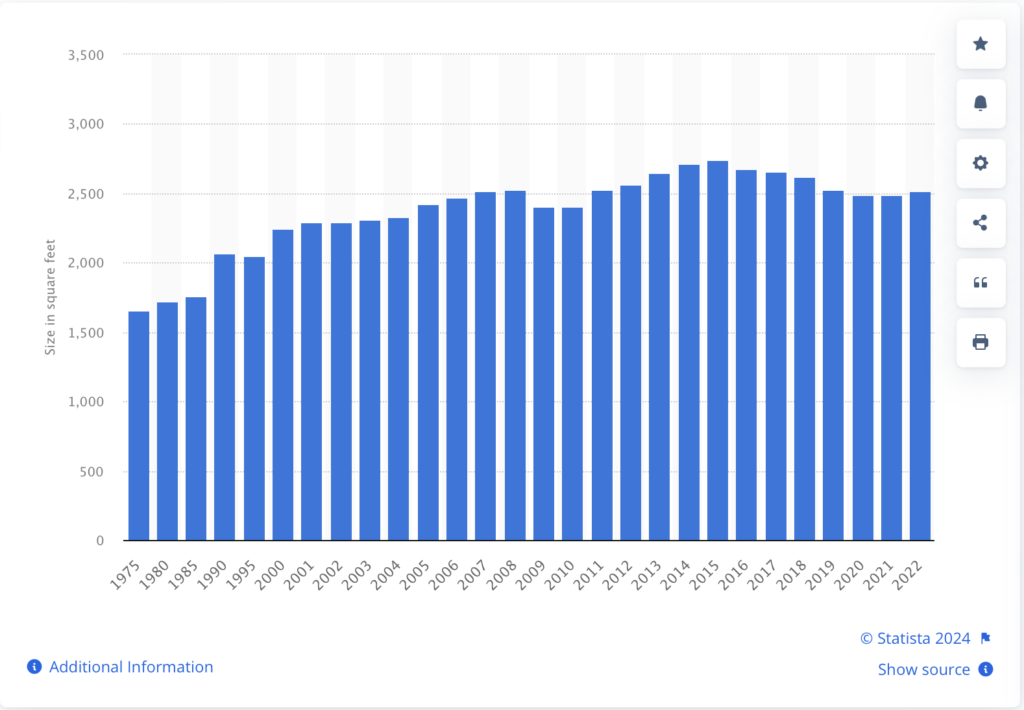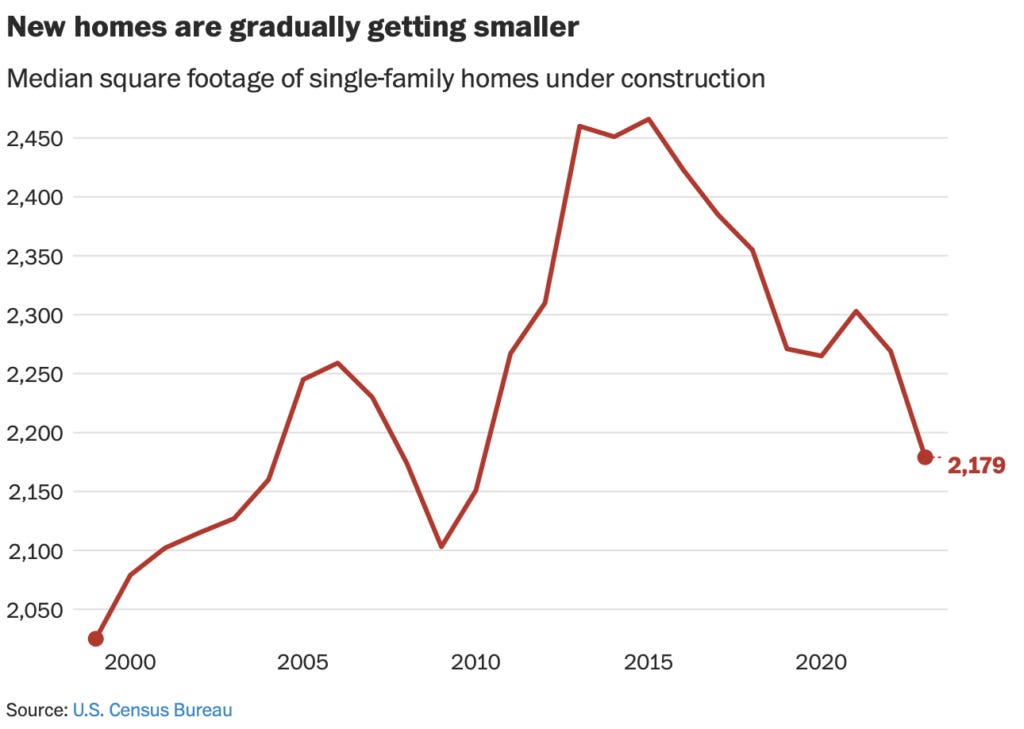 And if you look back to 1975, new home sizes nearly doubled through 2015. It seemed as though new homes were getting larger for my entire adult life until recently. In a world with high mortgage rates and high prices, average new home sizes are at a 13-year low, presumably to make them more affordable.
