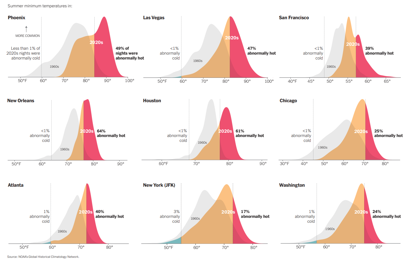 …analyzed temperate and population trends by decade, starting in the 1970s. They defined “extreme heat” as a day where the 24-hour average temperature was above 80 degrees, and “extreme cold” as a day when the average temperature was below 20. Then they looked at population changes by county, excluding Alaska and Hawaii.