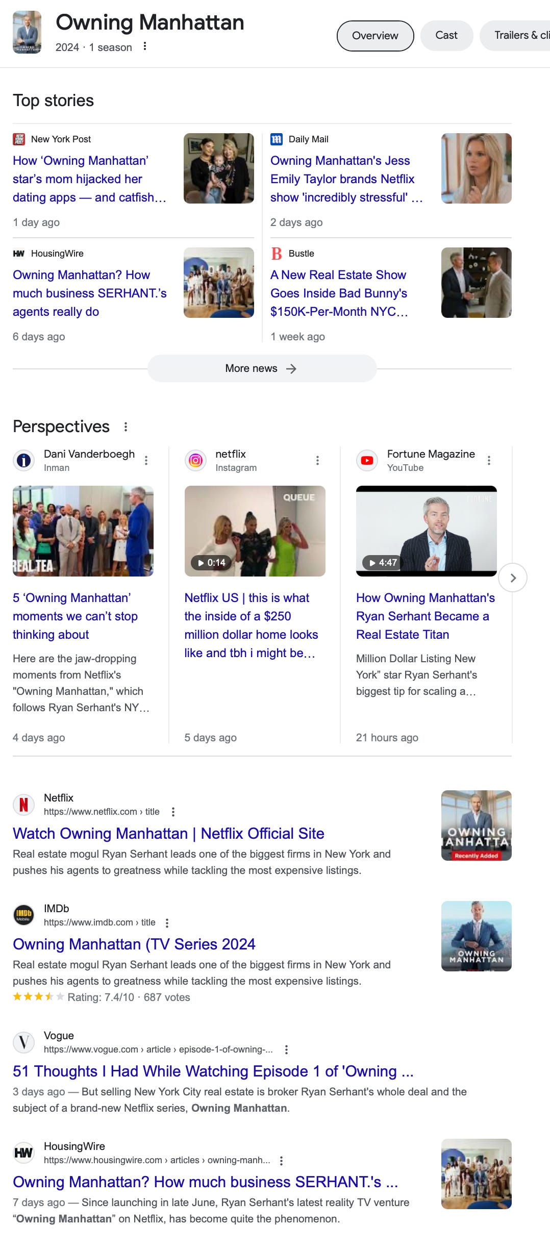 Ryan Serhant is at it again with a new real estate reality show. I think it’s his third rodeo. This one is called “Owning Manhattan.” He has successfully converted his celebrity into a real estate brokerage firm with 12 years of selling property. I can’t imagine how he sustains the intensity of his schedule with a personal life but he is clearly a master in getting the word out about his new effort. I wonder if that translates into better marketing of his properties in the same way. Just searching on the phrase “Owning Manhattan” yields a Google page like this:
