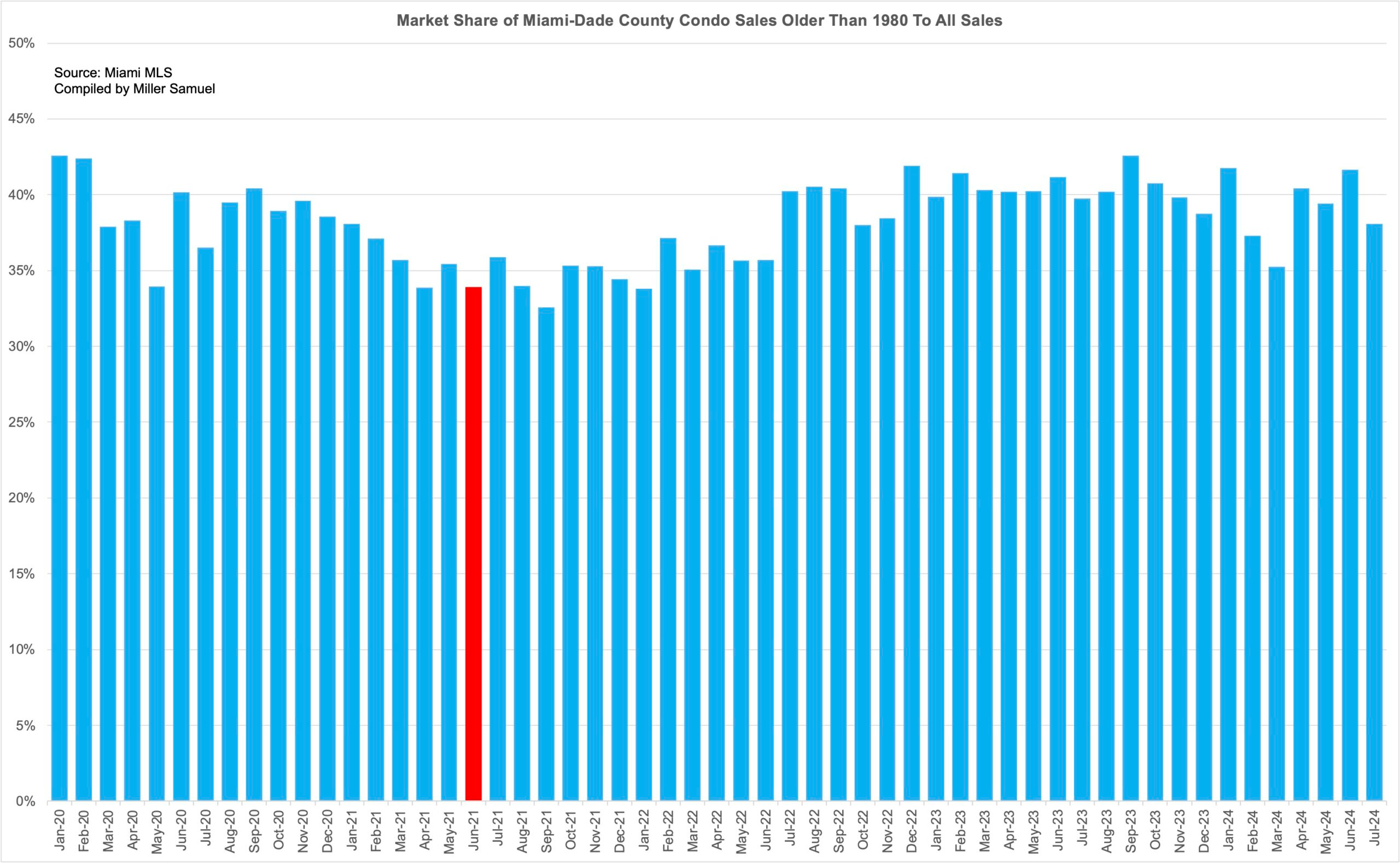 I took a cursory look at Miami-Dade County condo sales before and after the June 2021 Surfside tragedy, tracking the market share of sales older than 1980 (the Surfside building was constructed in 1981) versus all condo sales. The results were not telling. If anything, the market share of old sales rose after the tragedy. It makes me wonder if this reflected the pressure to purchase lower-priced condos with the spike in mortgage rates since 2022. If there is a better way to look at this, I’m all ears.