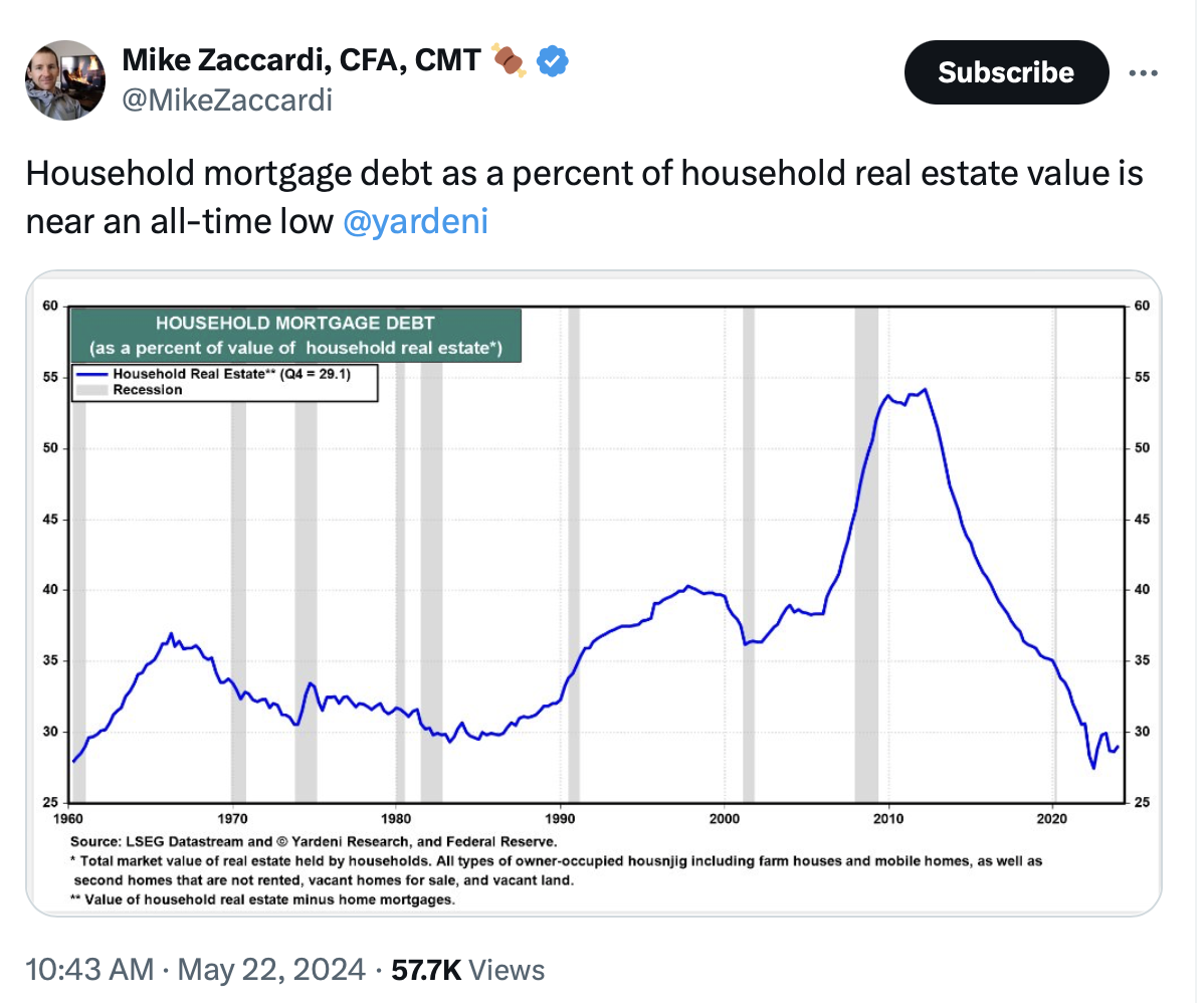 Although, household debt as a percentage of home value is at a record low – perhaps existing homeowners could compete with other existing sellers or new construction once they decide they need to sell. Just a thought.