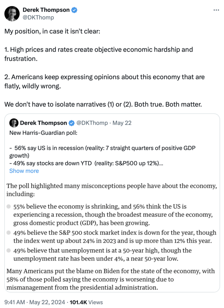 We’re in another post-pandemic confusion zone. Derek Thompson, a great explainer journalist lays out the caldron of political misinformation on the U.S. economy.