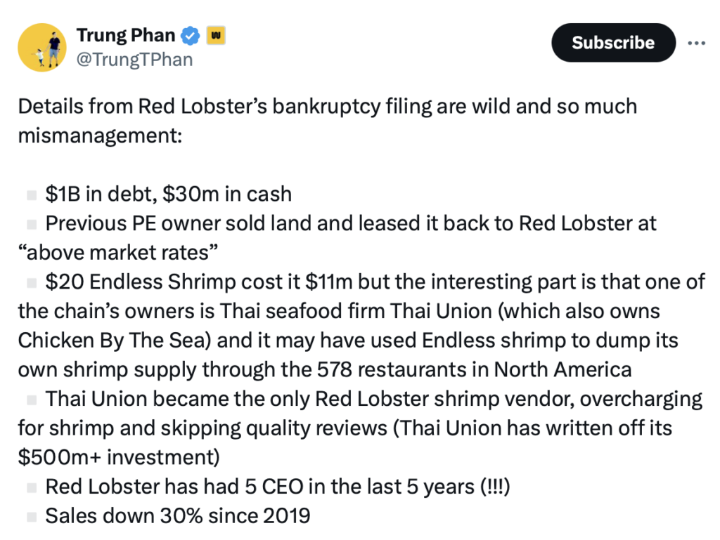 It’s not just about endless shrimp driving Red Lobster to bankruptcy. It was a land play and the new owner forced Red Lobster to pay wildly high rental rates on its land.