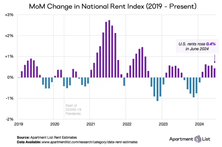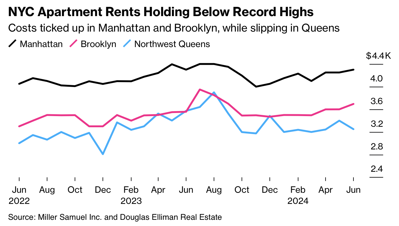 Rents rose nominally month over month in June. Manhattan rents are more than double the national number.
