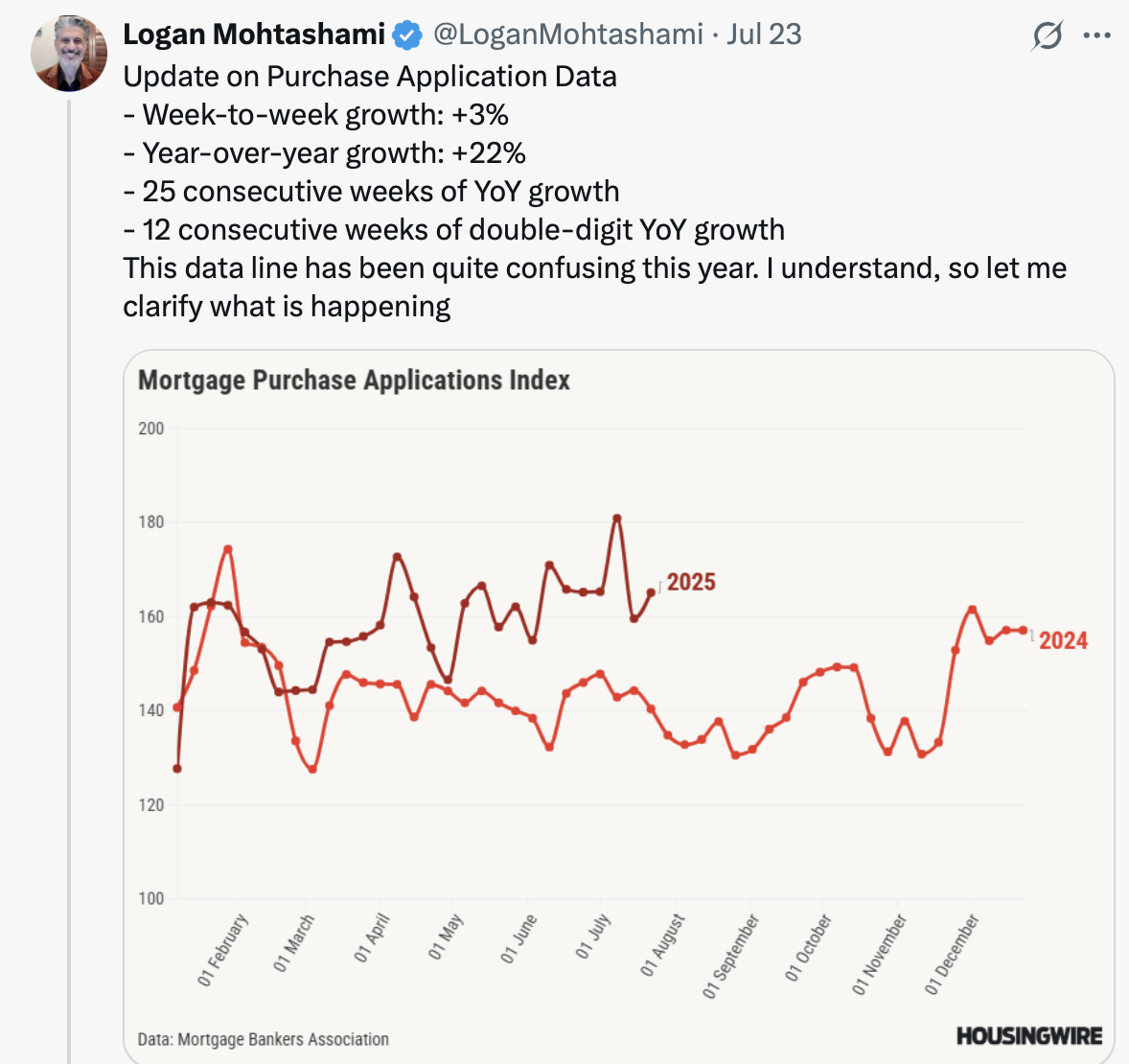 I’ve been doing an unusually high amount of public speaking lately and have run out of dad jokes. The takeaway at the beginning of each event is remarkably consistent: a lot of confusion about the state of the housing market. After all, existing home sales are down [gift link], but prices are up. New home sales are up, but new home prices are down. The number of renters in the suburbs has doubled over the past five years. Mortgage applications have been increasing, yet cash sales are also rising. It’s all explainable in terms of individual characteristics, but throwing them all into the same bucket is confusing. And the random chaos of current federal economic policy exacerbates the situation.
