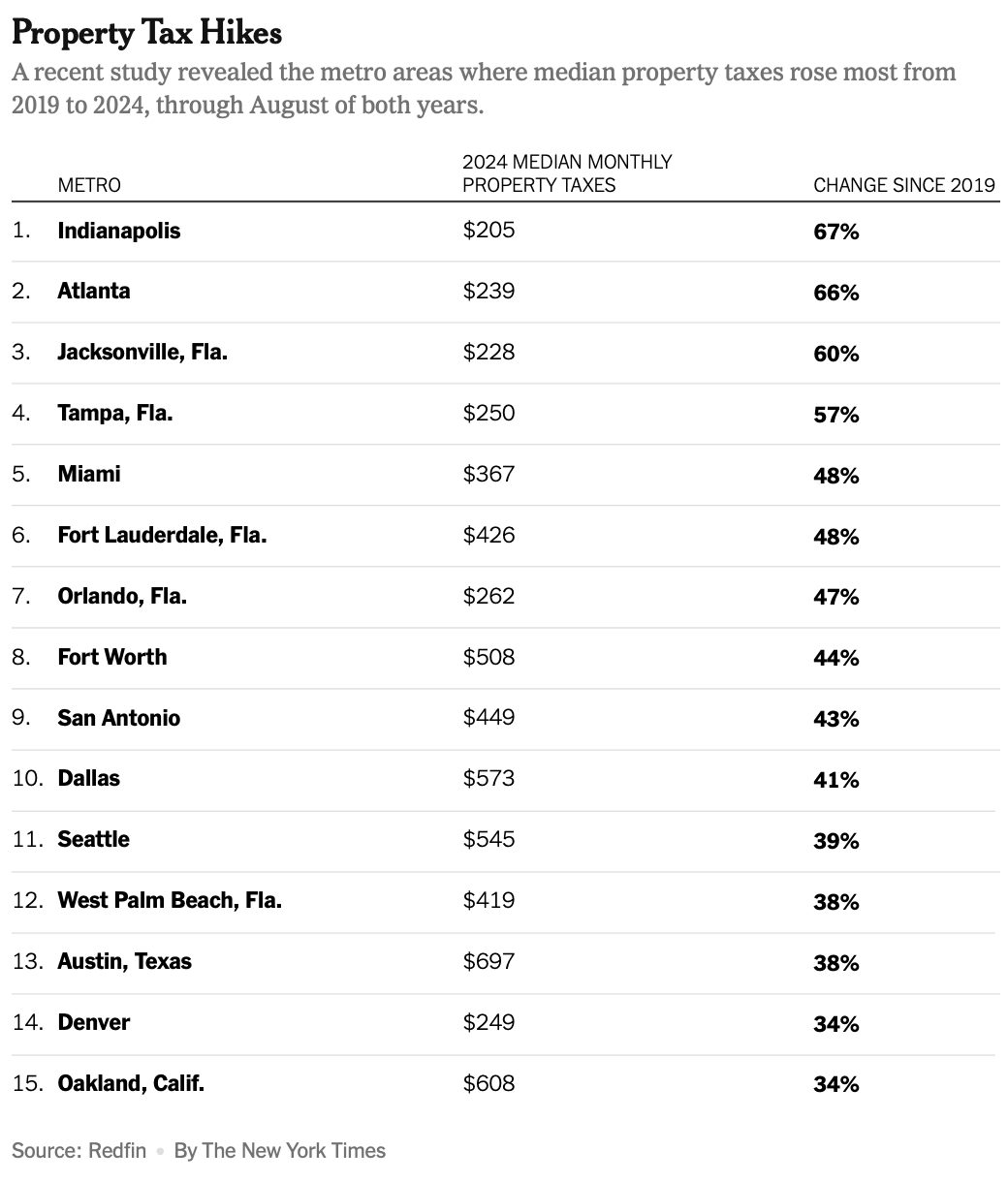 - Property Taxes Have Surged Nearly 60% in Tampa and Jacksonville Since 2019, Exacerbating Florida’s Housing Affordability Crisis [Redfin]