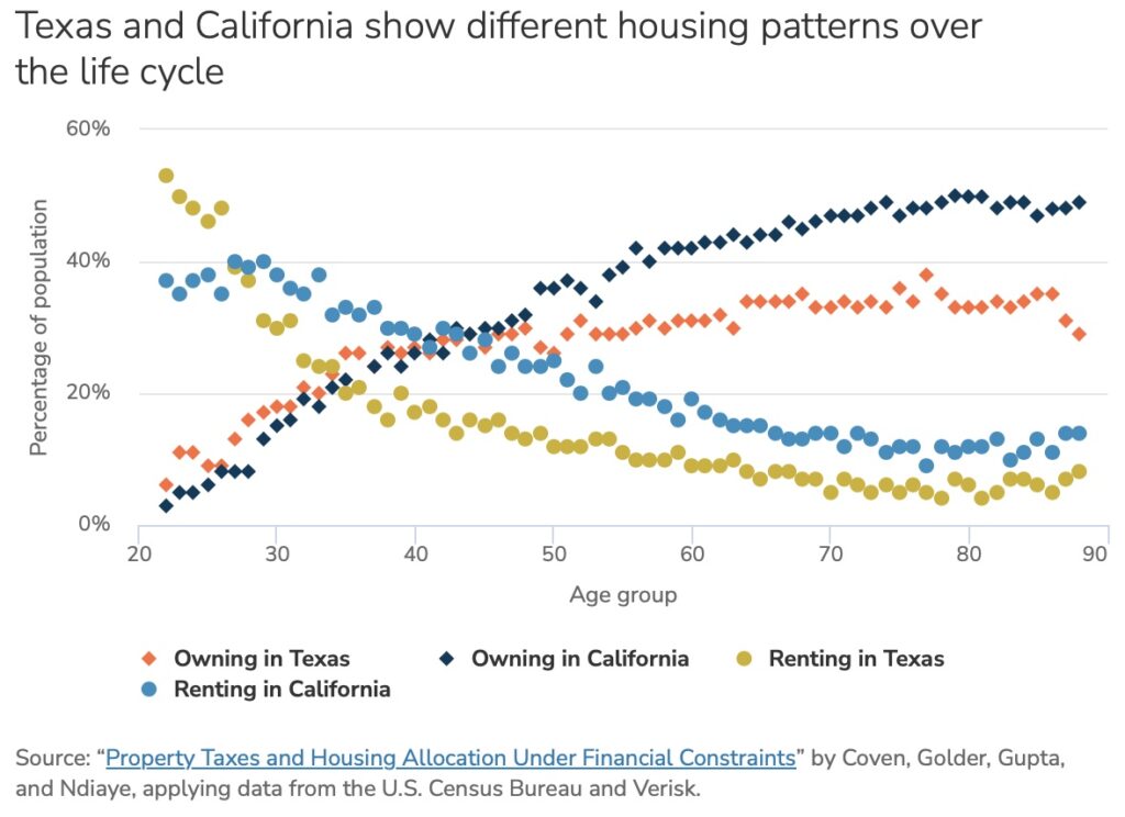 The economists compare owning and renting in the two states they use for their analysis. At younger ages, the homeownership rate is similar in high-tax Texas and low-tax California (Figure 2). But around age 50, the rates strikingly diverge.