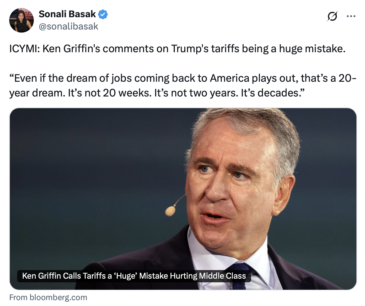 Ken Griffen of Citadel calls this tariff strategy a huge mistake. The shift to a manufacturing economy will take decades.