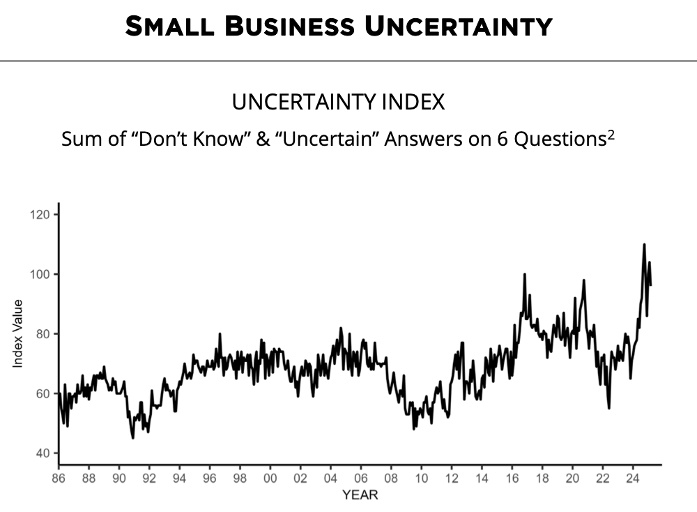 Small business owners who tend to be conservative, view this tariff situation as causing one of the most uncertain business environments ever tracked.