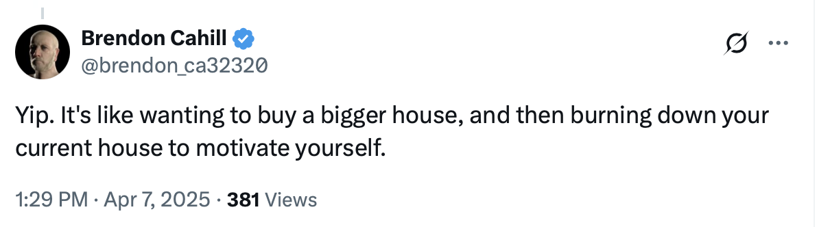 Every day, I endeavor to write about the nuances of the housing market. However, with the tariff tantrums coming out of Washington, DC, on an hourly basis, it is the only topic that matters right now. We don’t know anything because the administration doesn’t seem to understand its policy. The messaging behind the tariffs is that the administration wants to bring manufacturing back to the US. The explanation appears bizarre unless the consumer wants $10,000 iPhones and employees wish to have $3 per day wages. Financial markets don’t like tariffs, and their recent implementation will choke off capital from US markets (hint: investment). The US doesn’t have enough workers in this “new economy.” The following comment about the lack of strategy and seeming randomness of their implementation says it all: