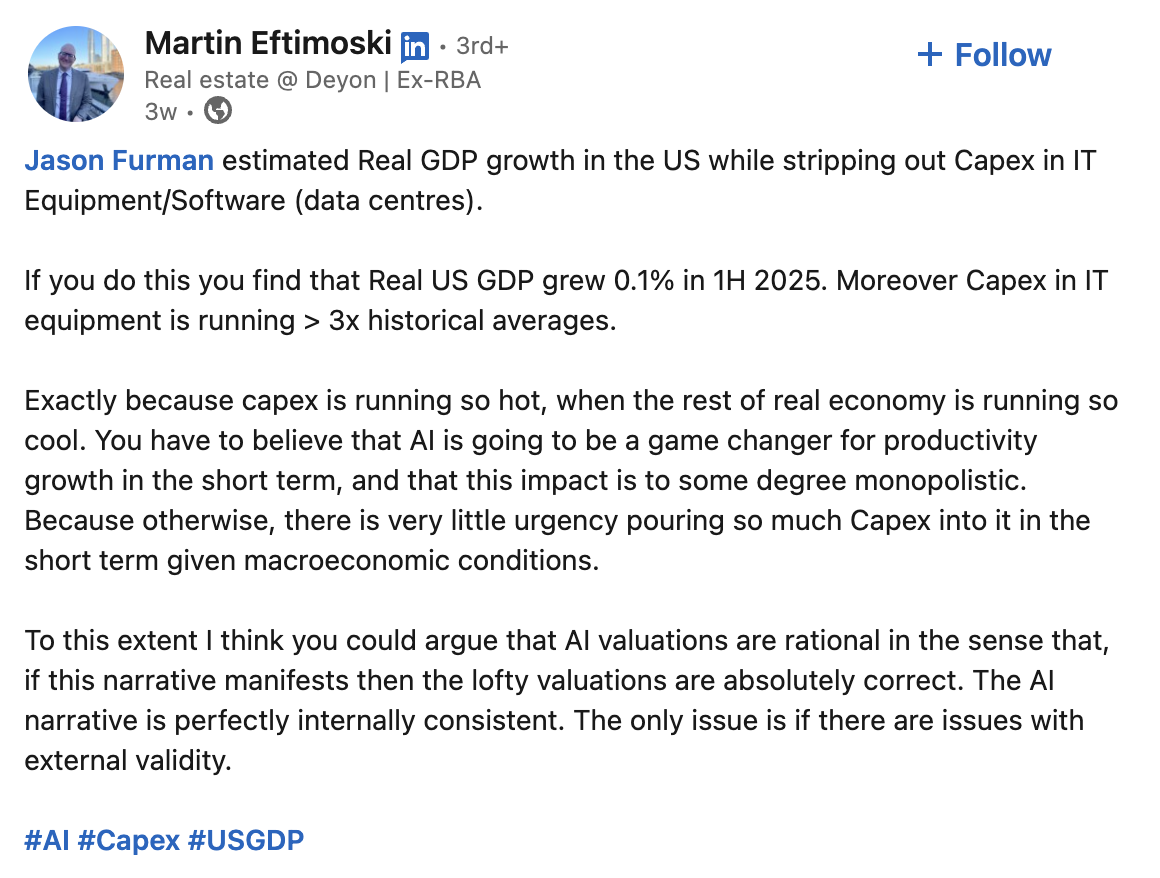 Tariffs as applied worldwide are inflationary and have made the Federal Reserve’s job more difficult. Since Liberation Day, the US economy has nearly stalled. As I mentioned earlier, in the first half of 2025, GDP grew by only 0.1% if AI Capex (investment in AI) was excluded from the economy’s calculations, as noted above in the charts. In other words, the economy is slowing quickly, but tariffs are also putting inflationary pressure on it.