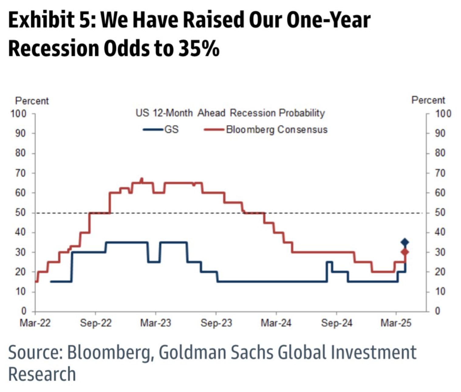 While a recession would bring lower mortgage rates, it would also cause lots of job loss. It’s probably tough to buy a home without a job, no? Goldman Sachs has seemed to be the voice of reason on recession odds over the past couple of years (blue line in the chart below), but even GS is showing much more concern about the impact of tariffs in recent days.