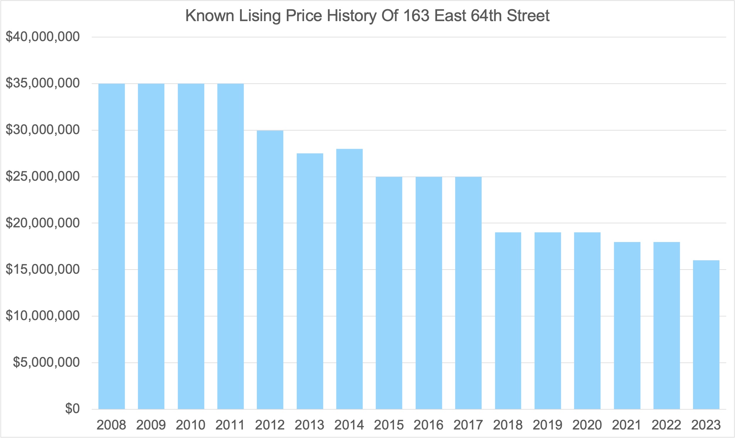 163 East 64th Street Listing Price Trends Many earlier listing records have been lost, as most online services began after the property was initially listed. The history was rebuilt partly with the help of news coverage.