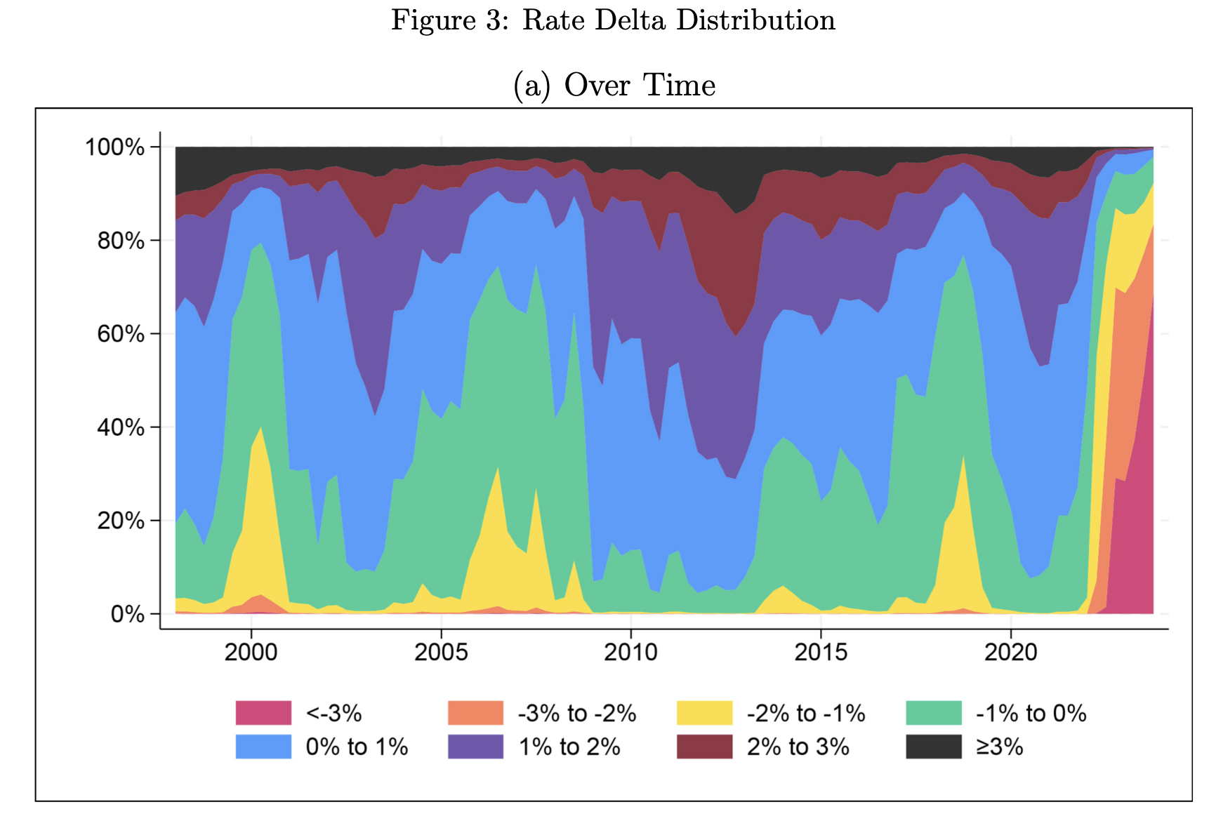 The FHFA is the regulator responsible for the GSEs, Fannie and Freddie, and they published a paper this week: Working Paper 24-03: The Lock-In Effect of Rising Mortgage Rates. As the spread between their pandemic mortgage rate and the prevailing mortgage rate expands, the probability of home sales falls. They found that: