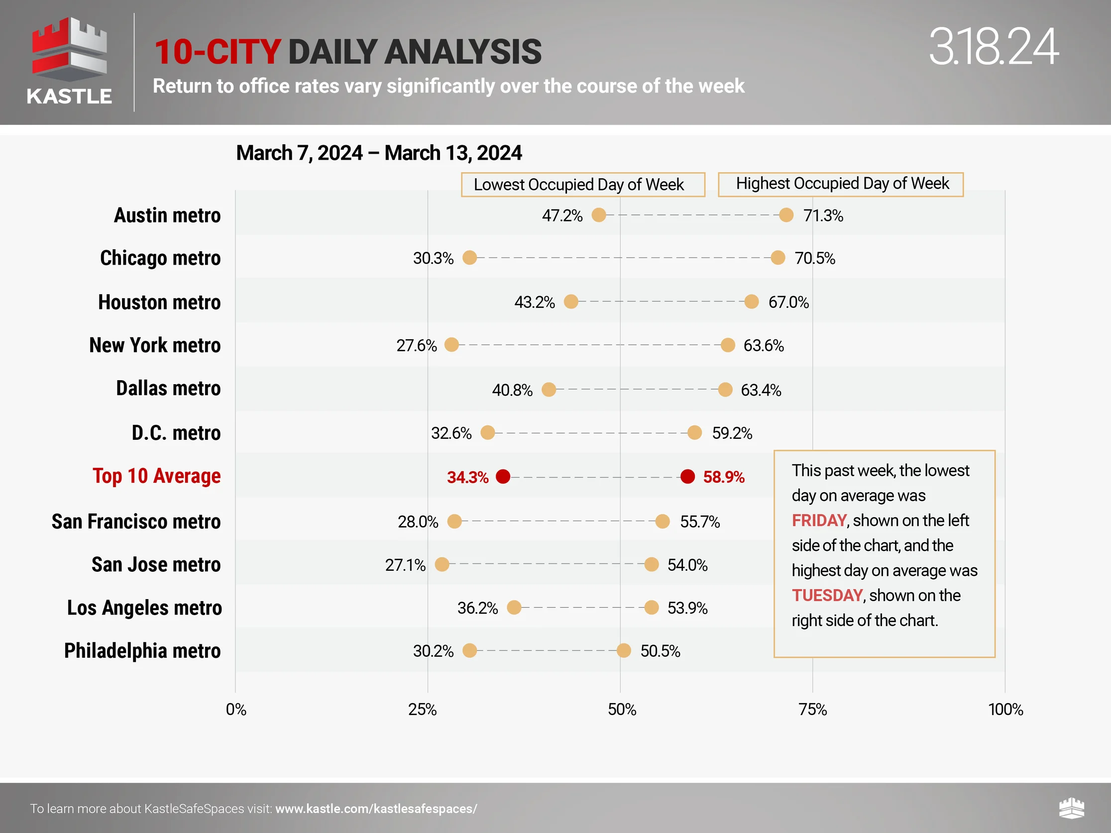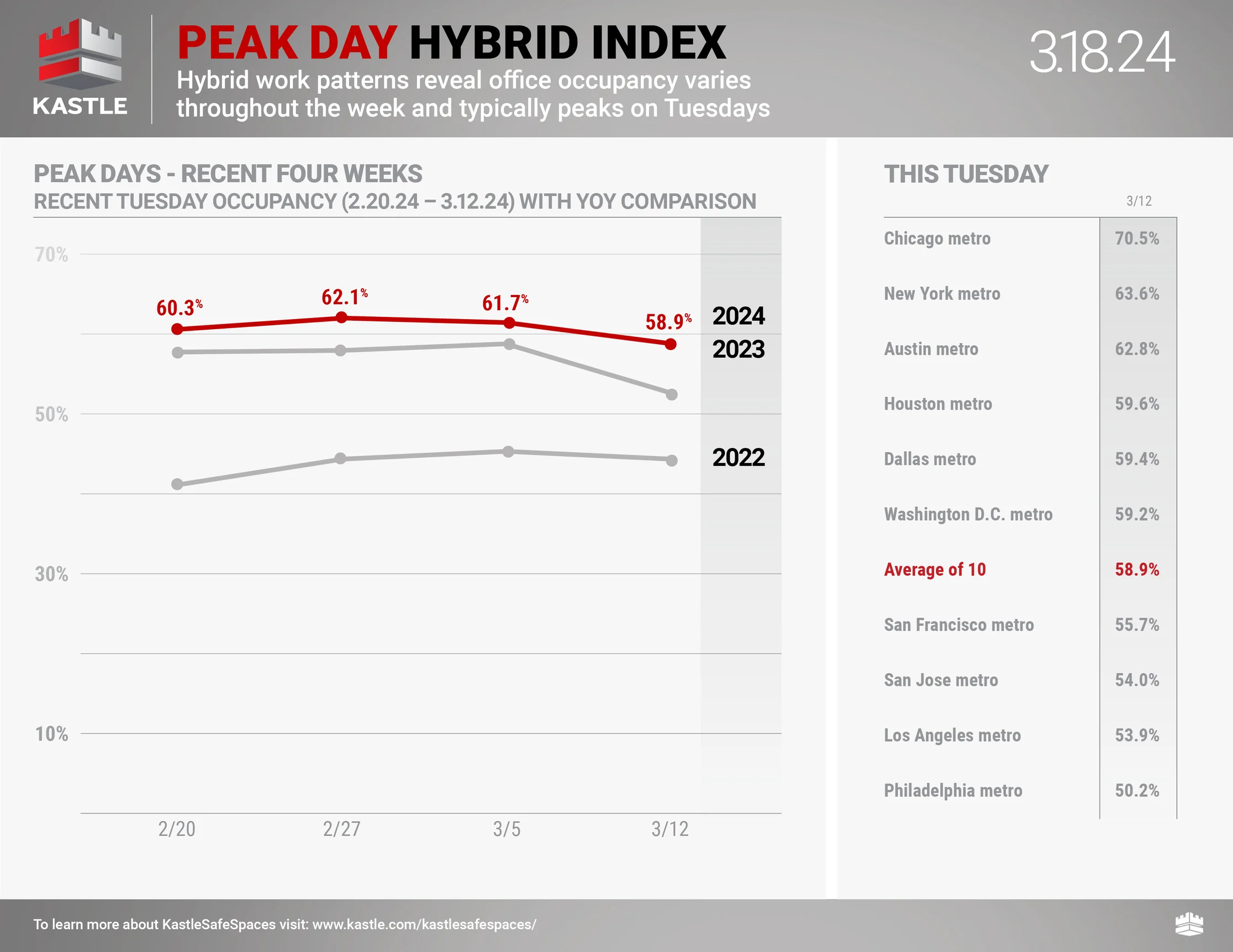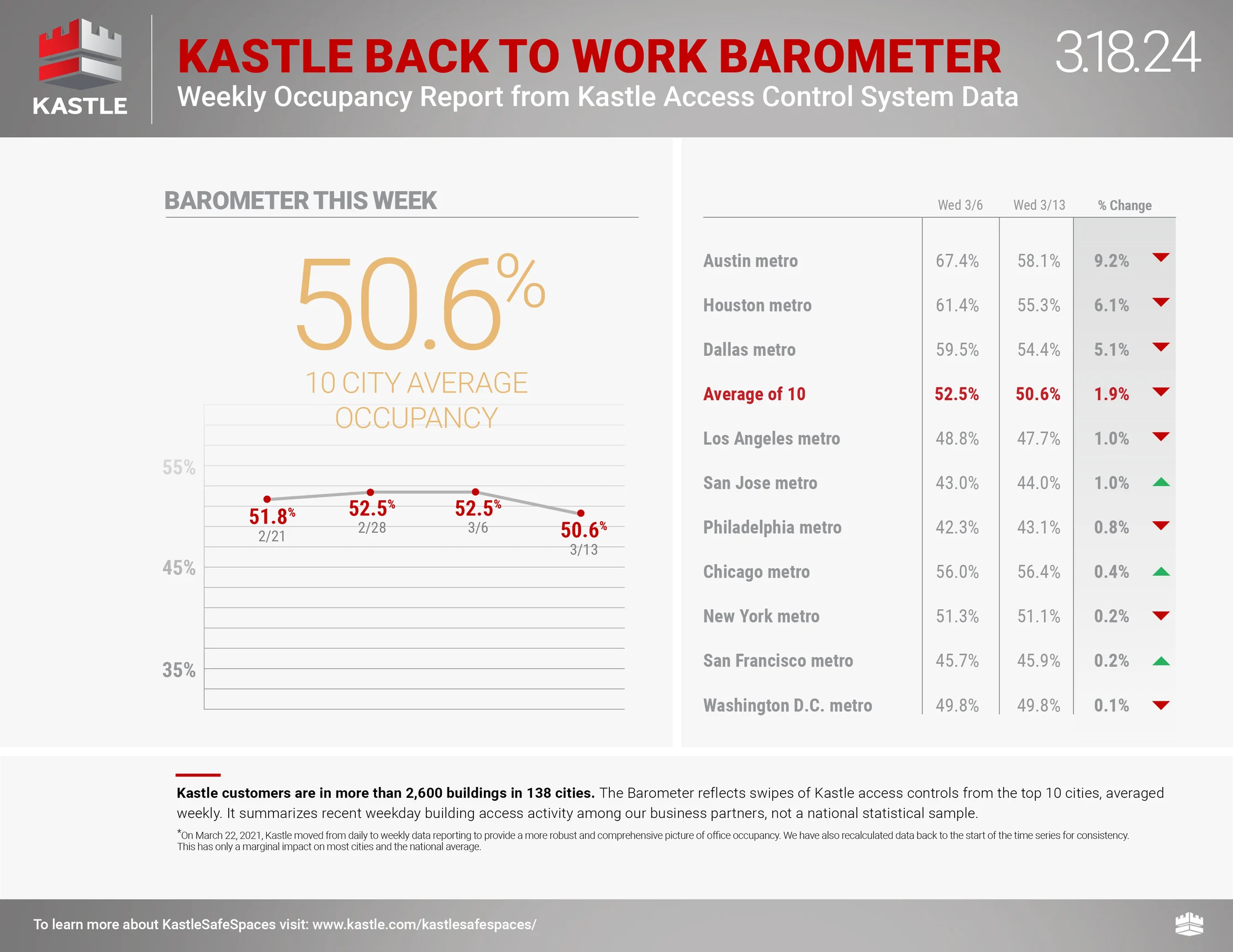 Remember that Kastle charts are overstating occupancy* because their pre-pandemic occupancy benchmark was 100%, which is incorrect (*measures card swipe activity as a proxy for occupancy). Still, they’ve become the standard benchmark for occupancy rates.