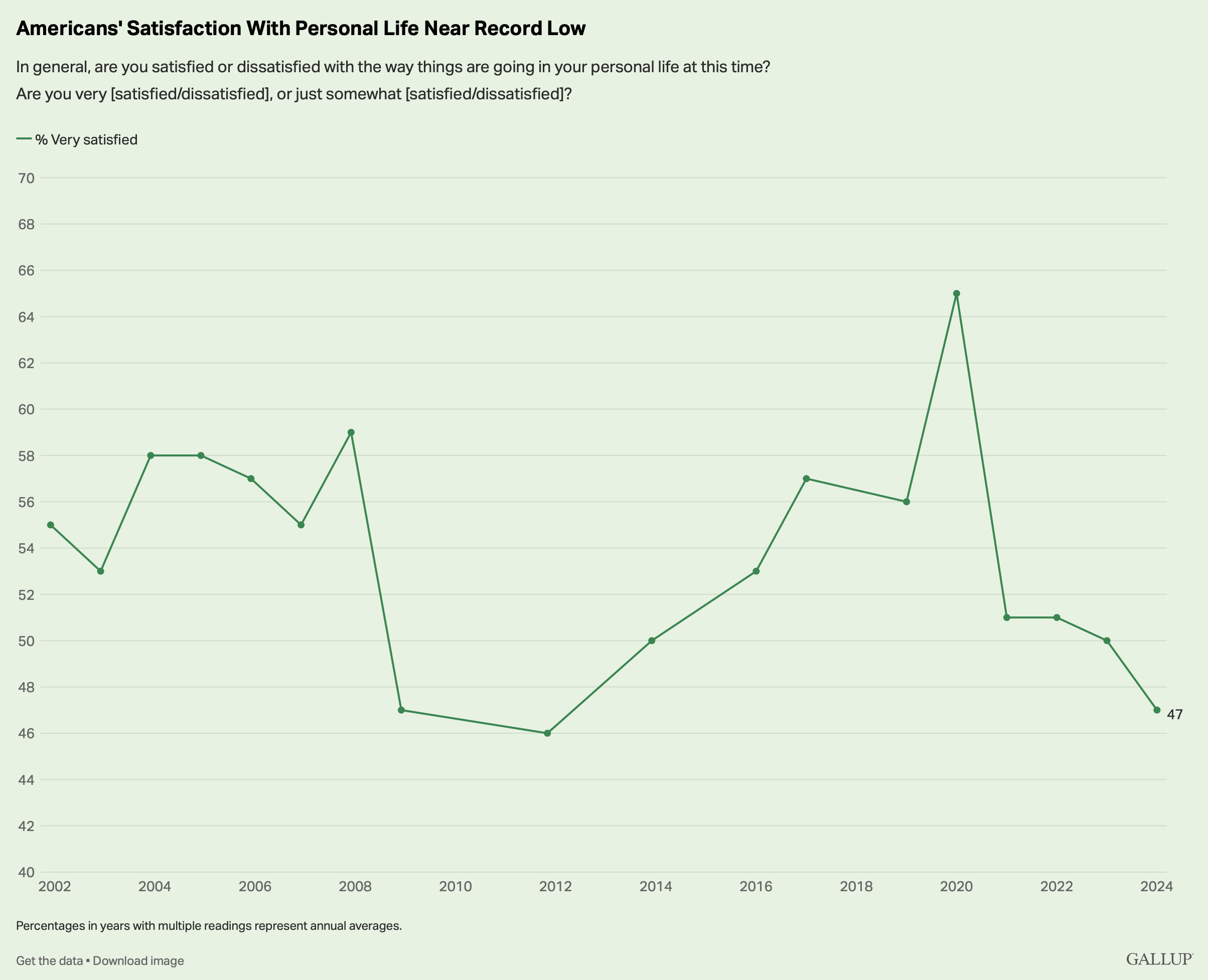 - Less Than Half of Americans "Very Satisfied" With Own Lives [Gallup]