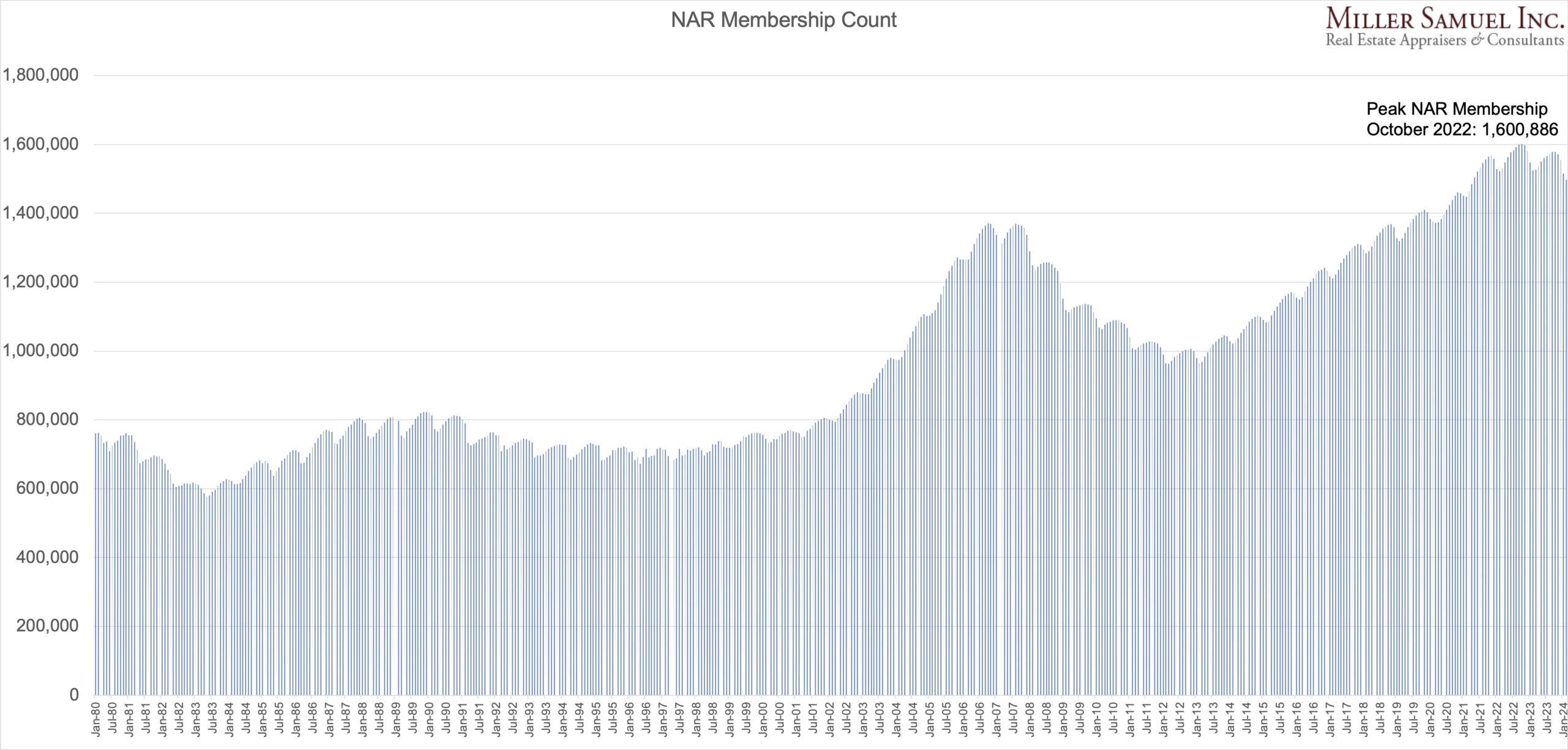 The purpose of NAR’s landmark settlement was to decouple the commissions paid by the seller from the buyer’s agent. After all, sellers don’t hire the buyer’s agent, nor does the buyer’s agent act in the seller’s best interests. The settlement means that users of representation services must pay for those services. In a traditional deal structure, the listing agent was usually paid 6% and gave 3% to the buyer’s agent. Now, the buyer could end up paying the buyer’s agent directly. NAR’s membership peaked at 1.6M+ in October 2022 and is down 6.5% through February 2024; much is due to lower sales volume in a 100% commission world. Now that membership is no longer required, I expect the trade group’s membership to collapse in a few years.