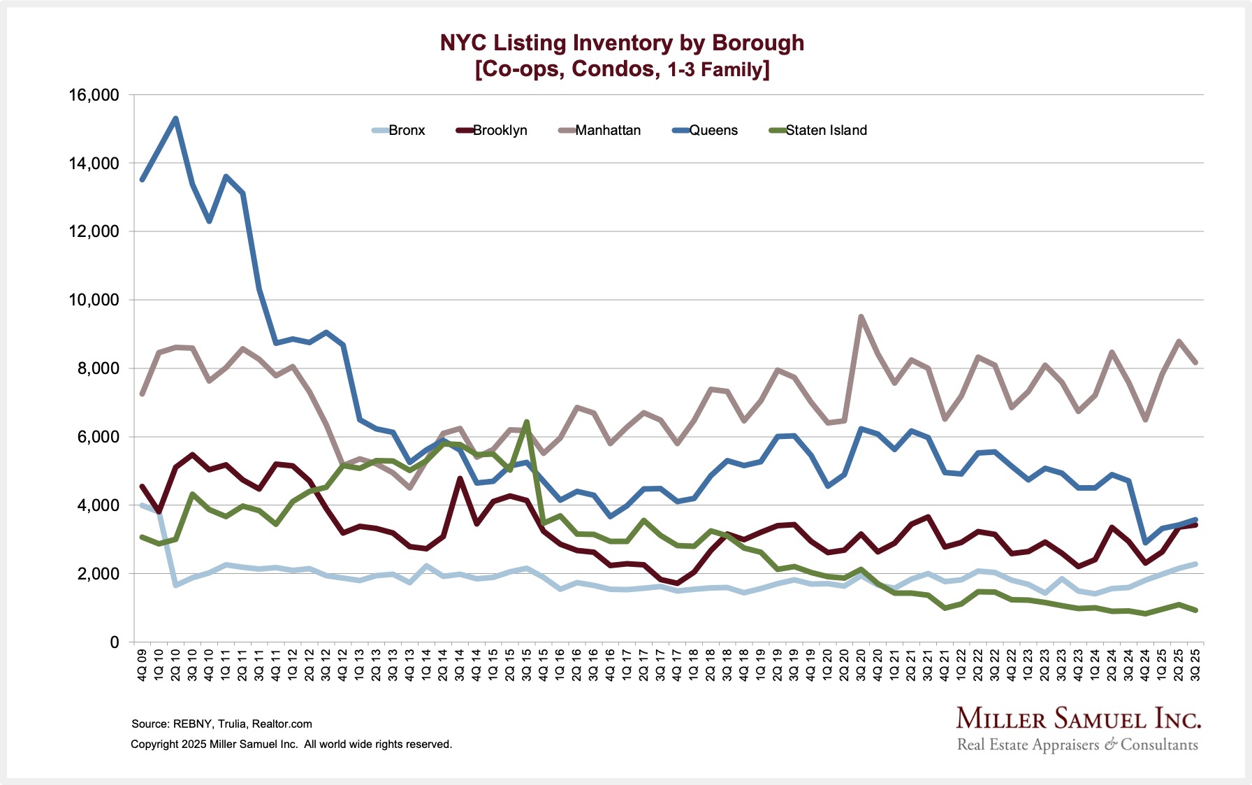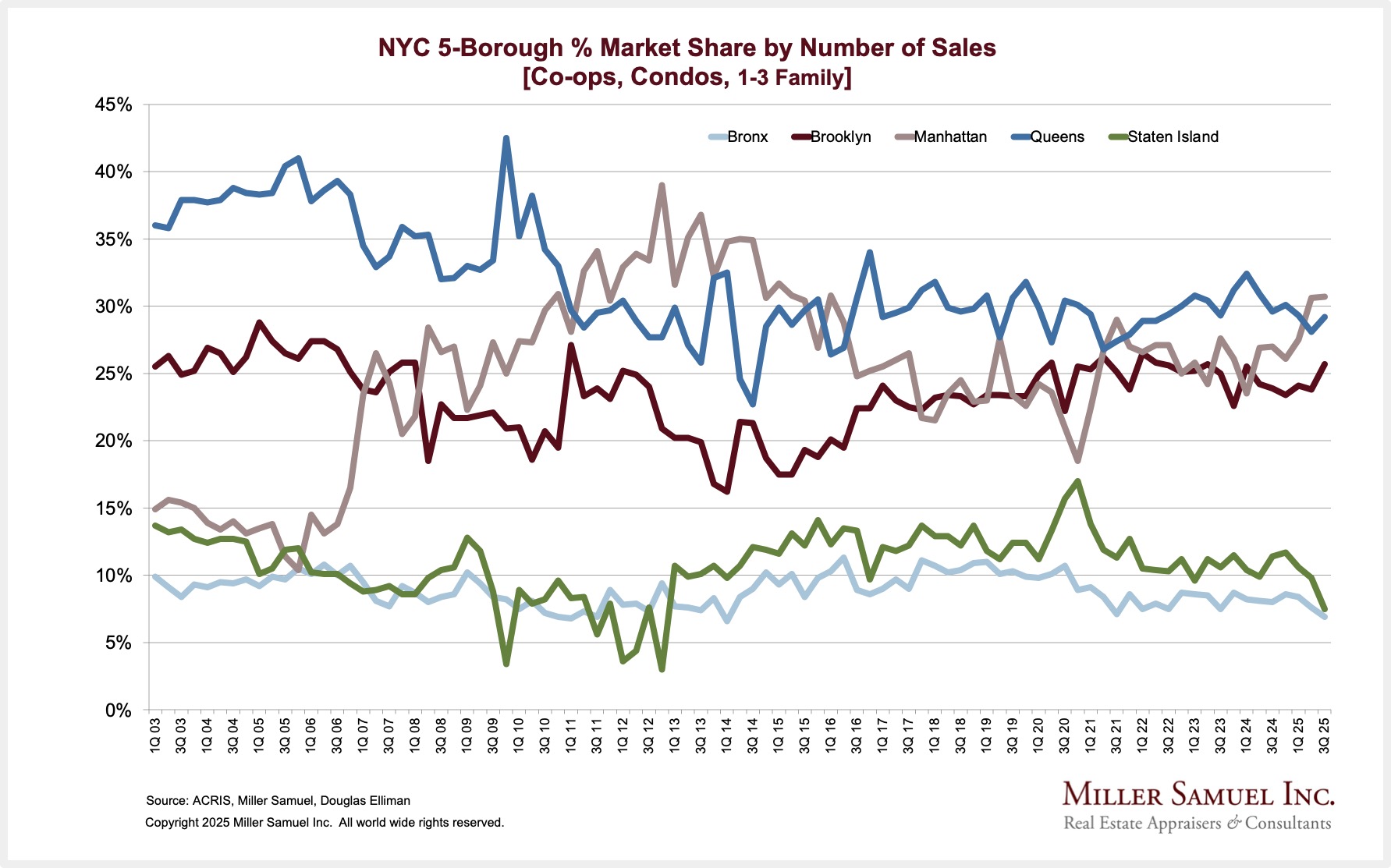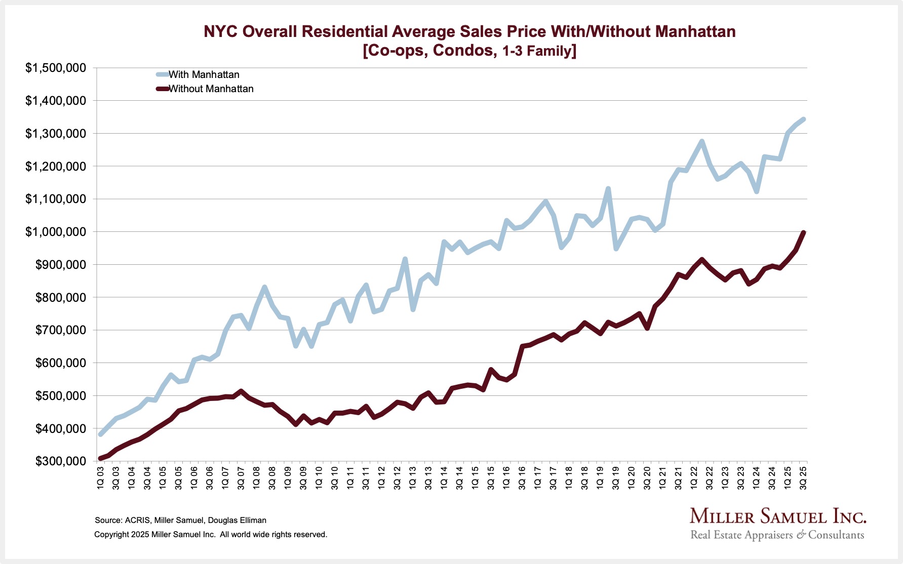 Chart Warning (there’s a lot) – Every quarter, I publish a broad summary of residential housing performance (Co-ops, Condos & 1-3 families) for all of NYC and each of the five boroughs. Three of the five boroughs are already part of the Douglas Elliman market report series, and the remainder I do for fun. Since I was already analyzing a chunk of the largest city in the US, I decided I could do the whole thing too. The Miller Samuel New York City Market Brief 3Q 2025 is already online, with one-, two-, and three-year comparisons by borough and the whole city. The two most expensive boroughs saw a meaningful increase in sales. The lower-priced remaining boroughs saw record pricing but a drop in sales, as lower-priced purchasers tend to be more interest-rate-dependent. The yellow highlights are price records. The only borough without a price record was Manhattan, which has been flat for largely a decade.