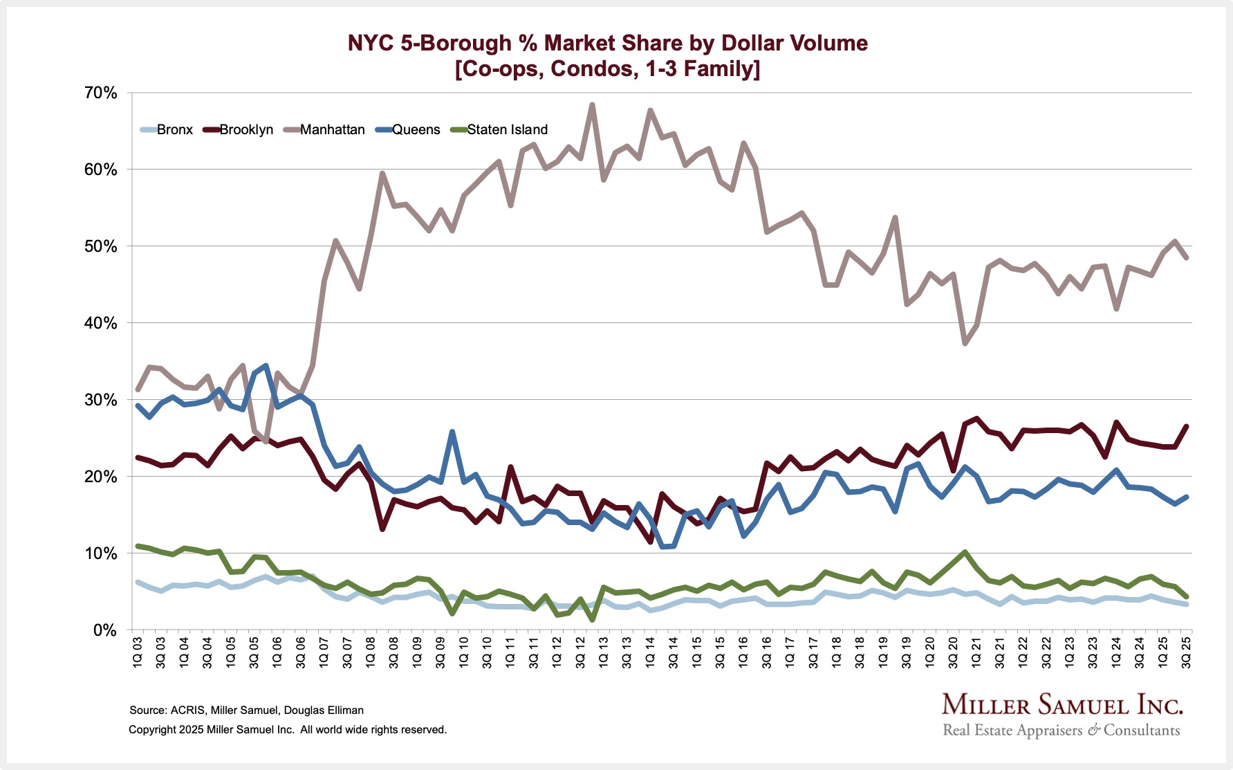 The market share by dollar volume shows that post-pandemic, Manhattan and Brooklyn are growing faster.