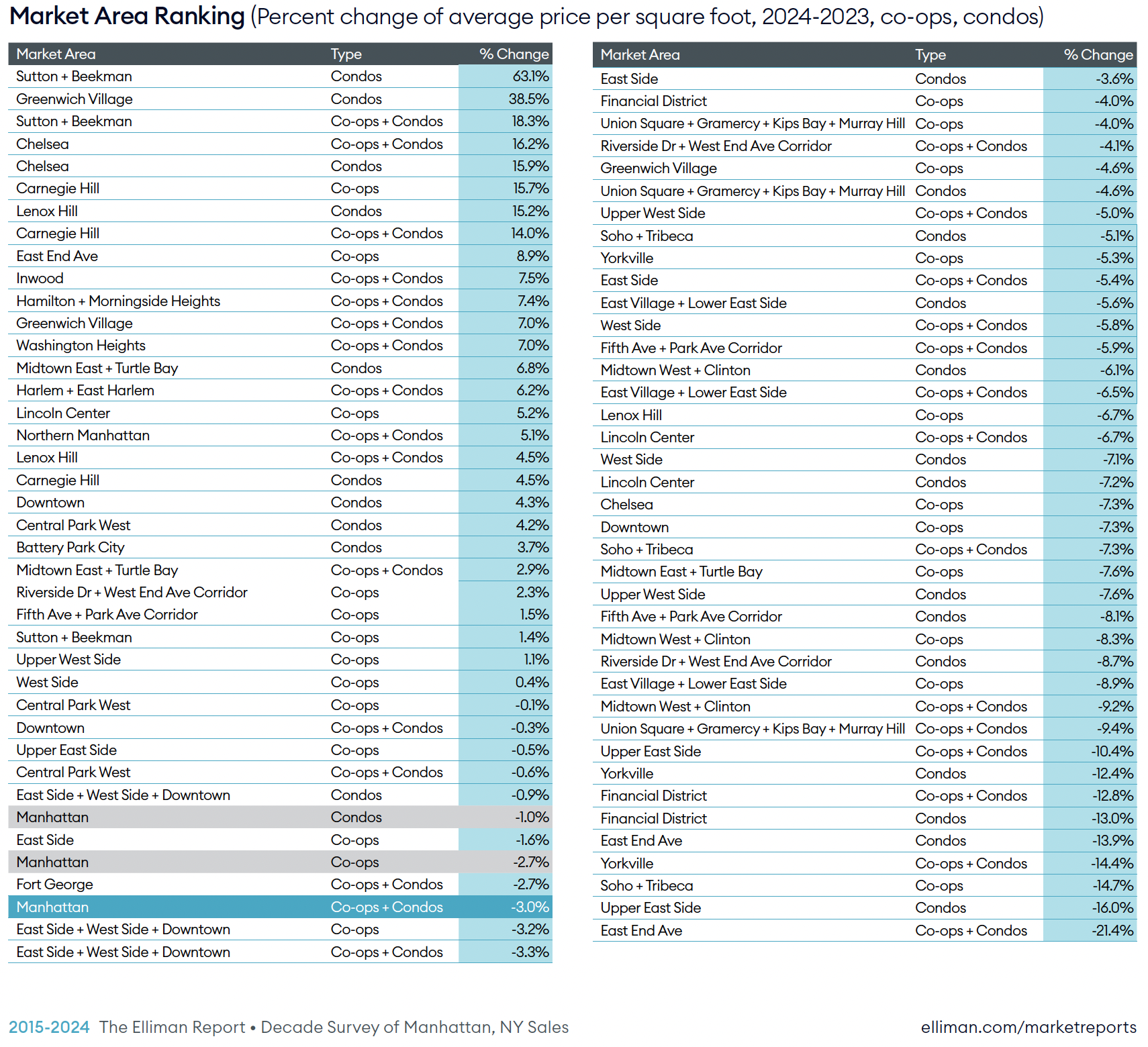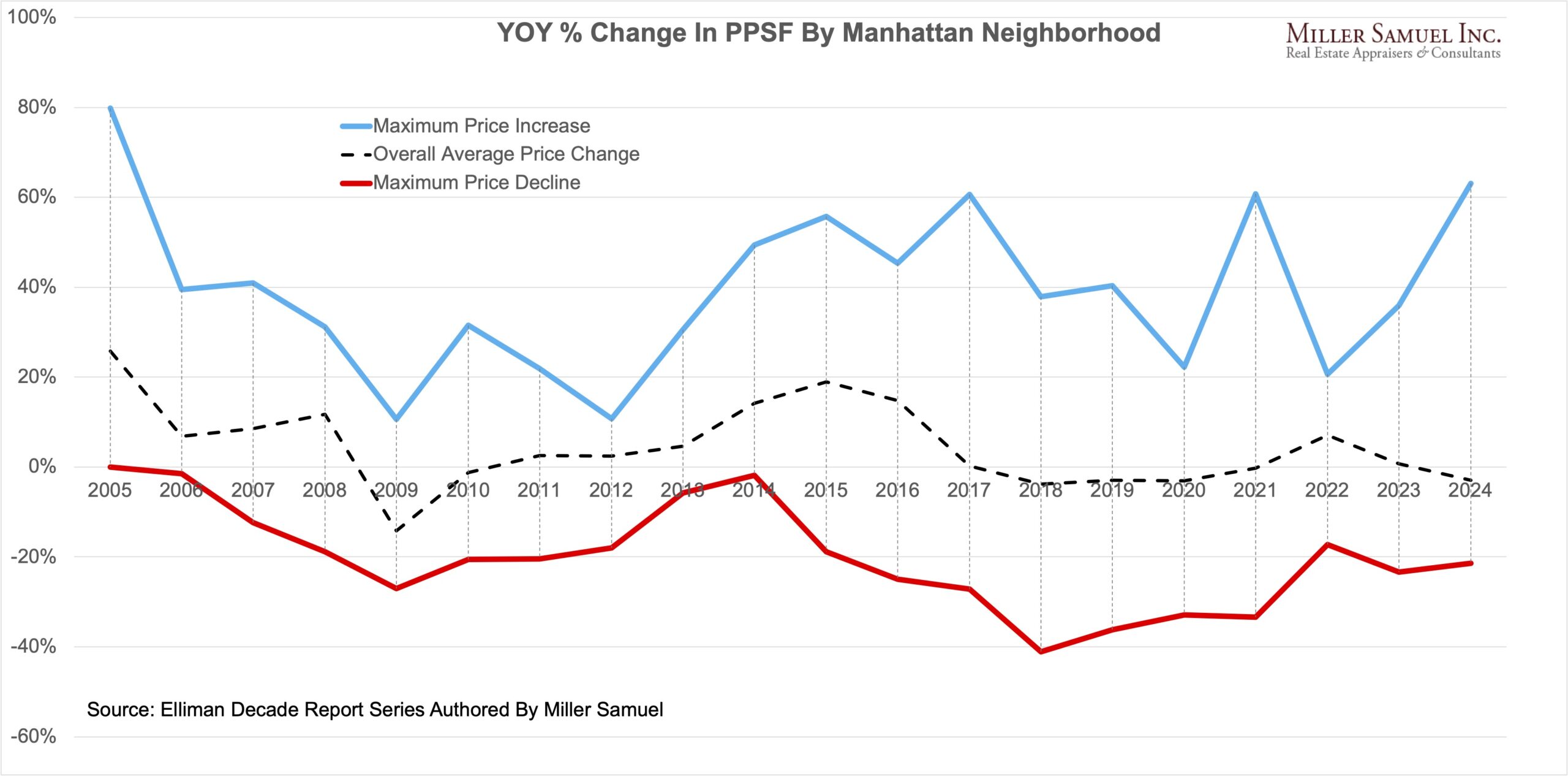 I used our YOY change in PPSF by neighborhood results from our Manhattan Decade series going back to 2005. The following table was taken from the most recent 2024 report.