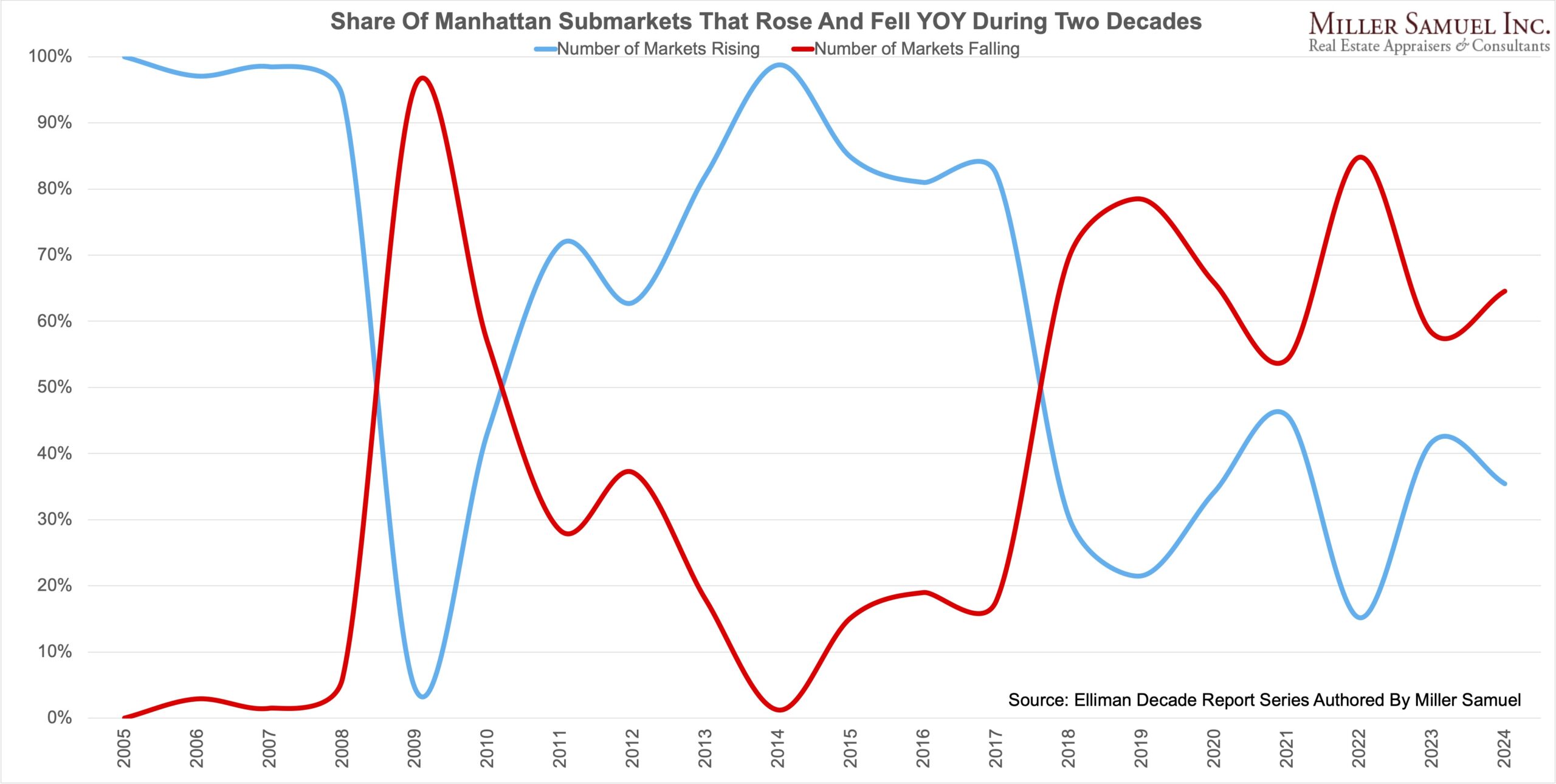 Share Of Manhattan Submarkets That Rose And Fell YOY During Two Decades