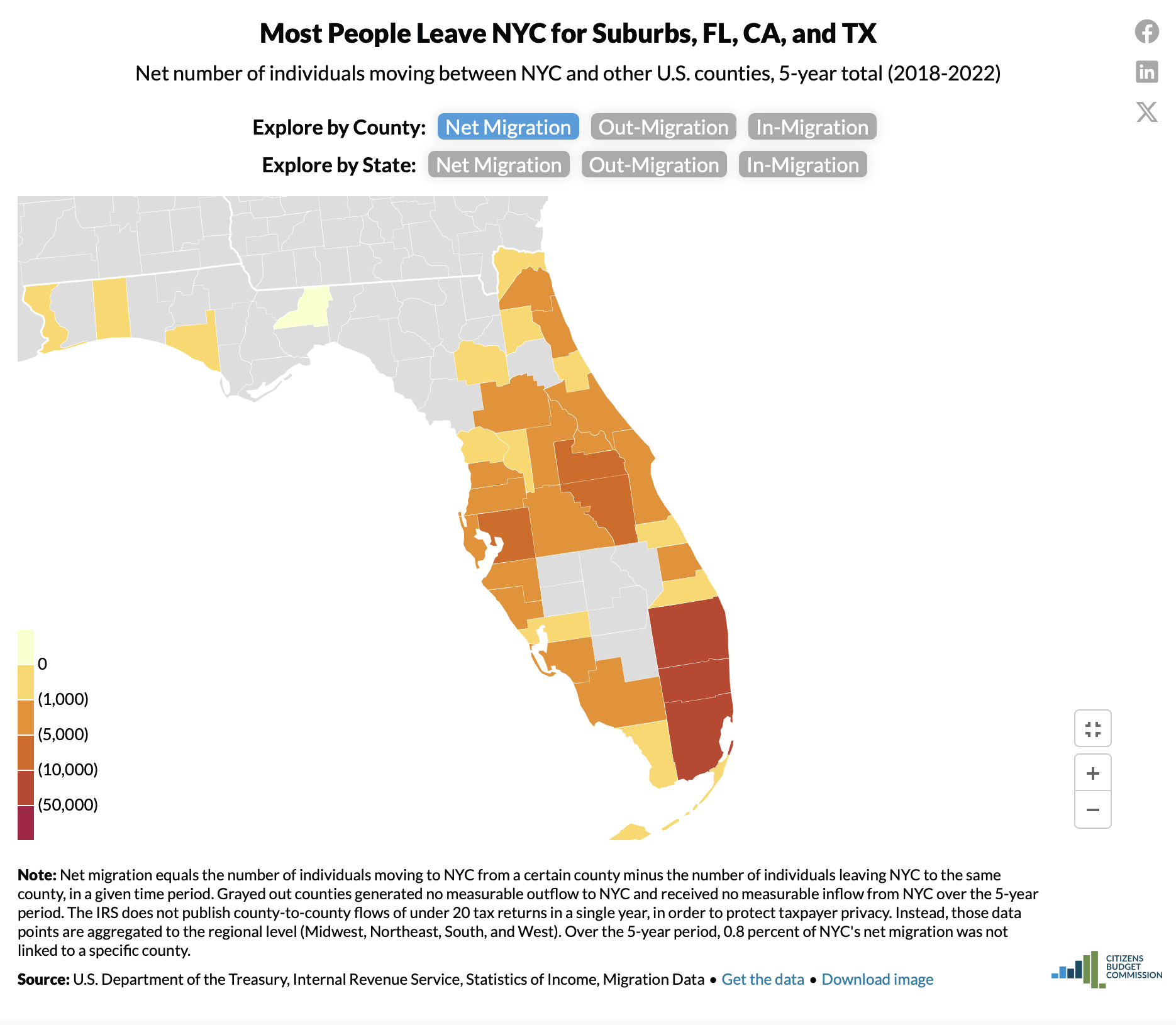 Before I moved to Manhattan, my Dad used to tell me that he could buy strawberries at 3 AM any time he wanted as a resident. After I moved there in 1986, I never had any urge to buy them at 3 AM, even though I love strawberries. I love to sleep more, but the potential to buy them at any hour seemed like real upside. I mean, who doesn’t want to buy them at all hours? But I digress… Yesterday, I returned from a short business trip to Miami. A friend happened to share an excellent Bloomberg piece NYC Lost $9 Billion of Income to Miami, Palm Beach in Five Years (gift link), which also shows that NYC’s net population growth has been positive for two years, counter to national (incorrect) conventional wisdom. Their report and dashboard used in the Bloomberg piece are a product of The Citizens Budget Commission (CBC), a nonpartisan, nonprofit civic think tank and watchdog. I’ve been a big fan of the CBC over the years and have worked with them in the recent past.