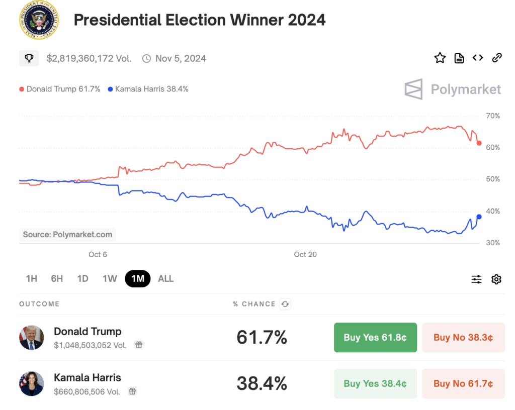 More than $100 million has been bet in Polymarket on the presidential race. The majority of that betting comes from only four accounts controlled by one person:
